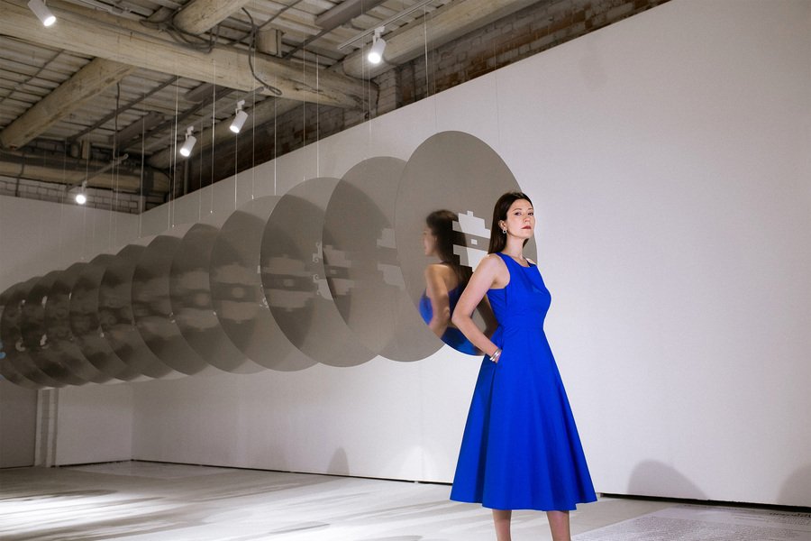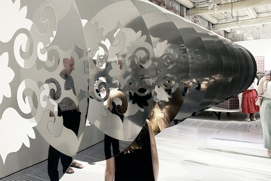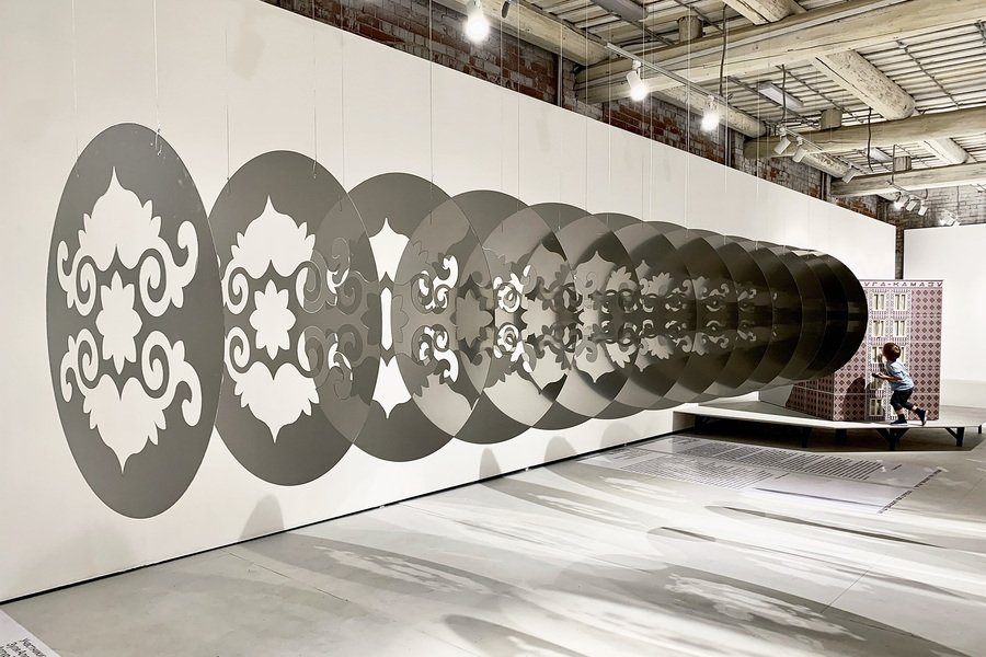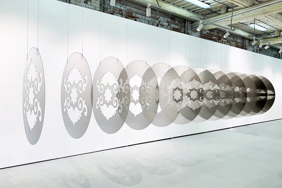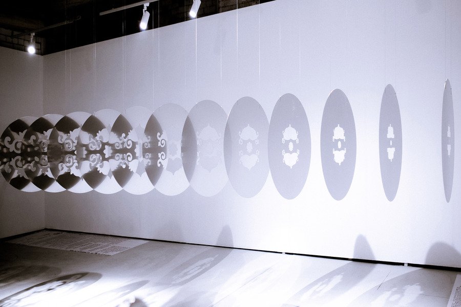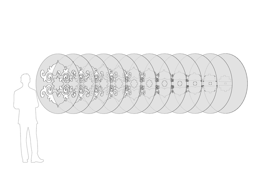 Инсталляция предлагает понаблюдать за процессом трансформации / преображения старой эстетической модели (фрагмент татарского орнамента) в новую транснациональную форму — пиксельное изображение. Превращение искусства в современное искусство. Посмотрите, как меняется узор с каждым последующим элементом, на каком этапе вы хотели бы остановить трансформацию? Возможно, ее можно продолжать бесконечно, пока форма не превратиться в ничто.