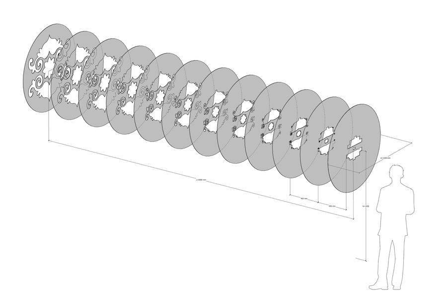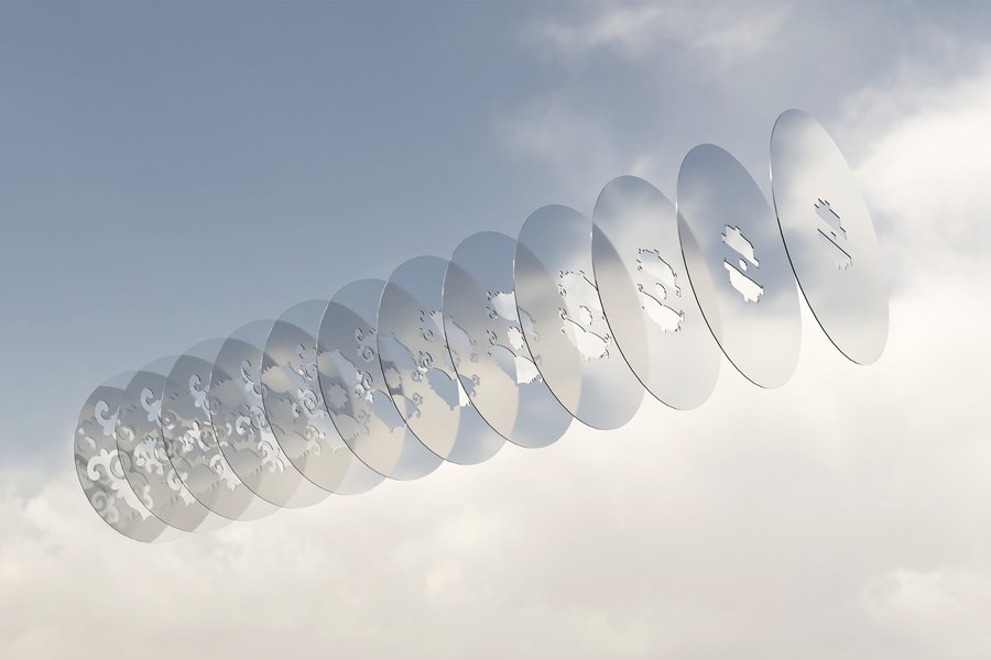 (зеркальная сталь 0.7 мм, лазерная резка на металлических тросах) Диаметр элементов 1100 мм, длина инсталляции варьируется (5-6м)