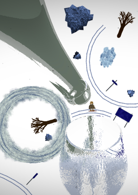 Мальчик на лыжах представил себя героем платформера. Мир растянулся в одной плоскости, перемешались виды. Лыжная прогулка стала детской игрой.