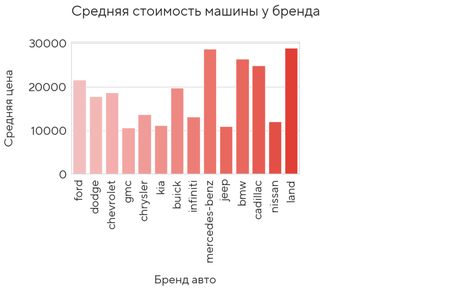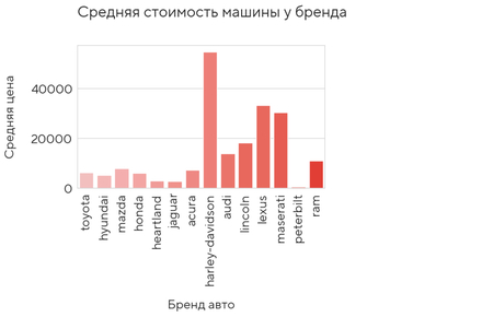 Сначала я узнала среднюю сумму машины у каждого бренда в датасете. Затем отобразила анализ на графике, так как значения очень разняться, поделила их на два графика — на первом большие значения, на втором меньшие. Я использовала столбчатую диаграмму для наглядного просмотра разницы брендов в цене.