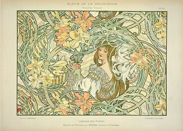«Альфонс Муха создал сборник, который подразумевался, как учебное пособие для дизайнеров, где можно было найти таблицы орнаментов, примеры отдельных деталей предметов, а также целых комплектов посуды, мебели и ювелирных украшений в стиле Ар-Нуво.» [3]