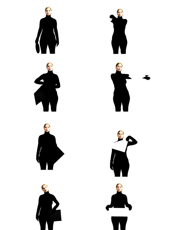 В перформансе я трансформирую облик своего тела за счёт комбинирования его с разными предметами, из-за чего форма тела меняется. Черные и белые предметы на фоне черной одежды будут деформировать силуэт и объём.