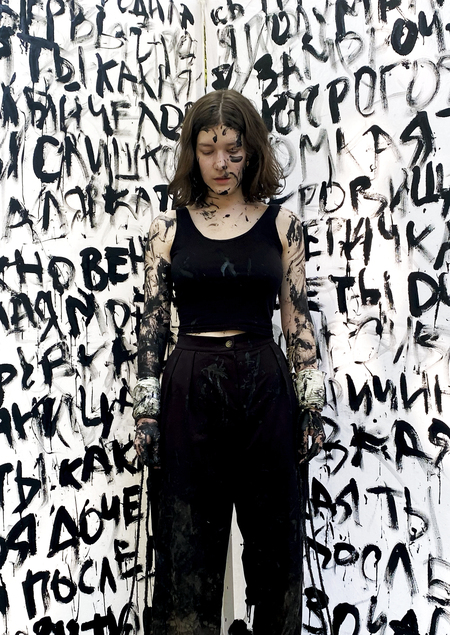 Исполнительница стоит внутри сложенной конструкции и пишет фразы, которыми когда-либо её идентифицировало общество.