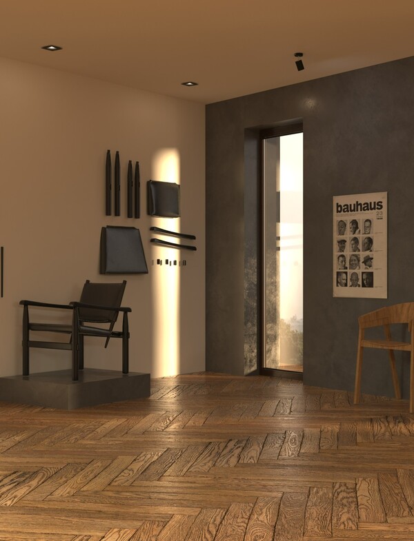 В предыдущей части проекта были визуализированы входные группы, кафе напротив входа, а также магазин при выставке, в котором любой посетитель может приобрести миниатюрные модели стульев, представленных на выставке.