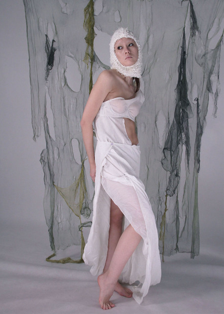 Хрупкость и уязвимость переданы через легкие образы белых и бежевых цветов и через открытые ломанные позы. Запутанность же отражена в сет-дизайне: дырявое матерчатое полотно ткани болотных оттенков.