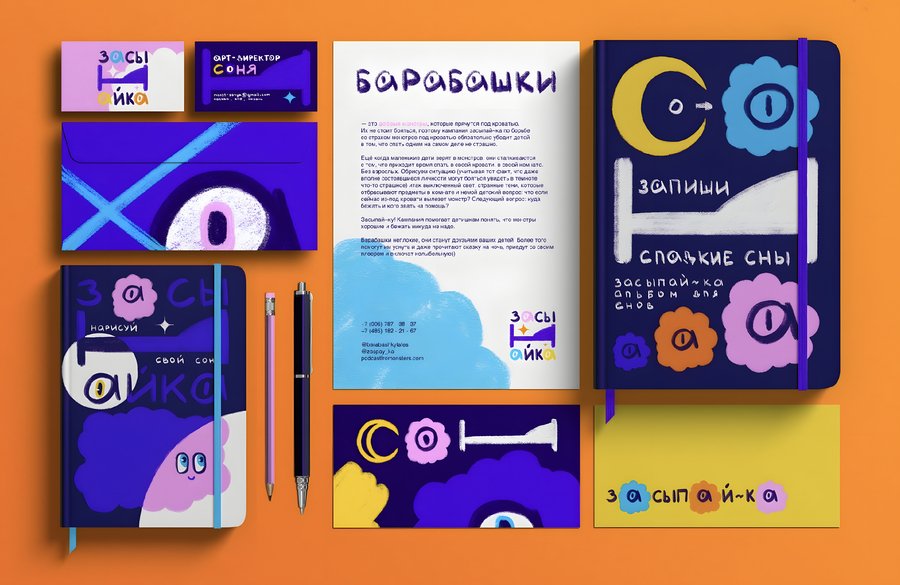 Для создания уникальных элементов айдентики, таких как блокноты, пижамы, ночные маски и подушки, использовался инструмент Leonardo.Ai, при этом все предметы обладают общей особенностью — блестяшками (я применила одну из функций нейросетки, которая называется elements — sparclecore). Для поддержания стилистики были внедрены текстуры и приблизительные цвета из сгенерированной Adobe Color палитры.