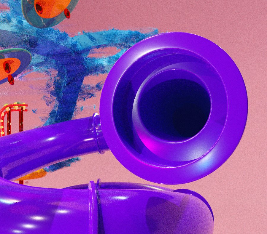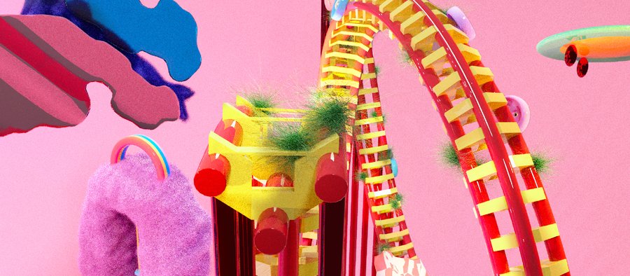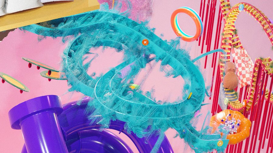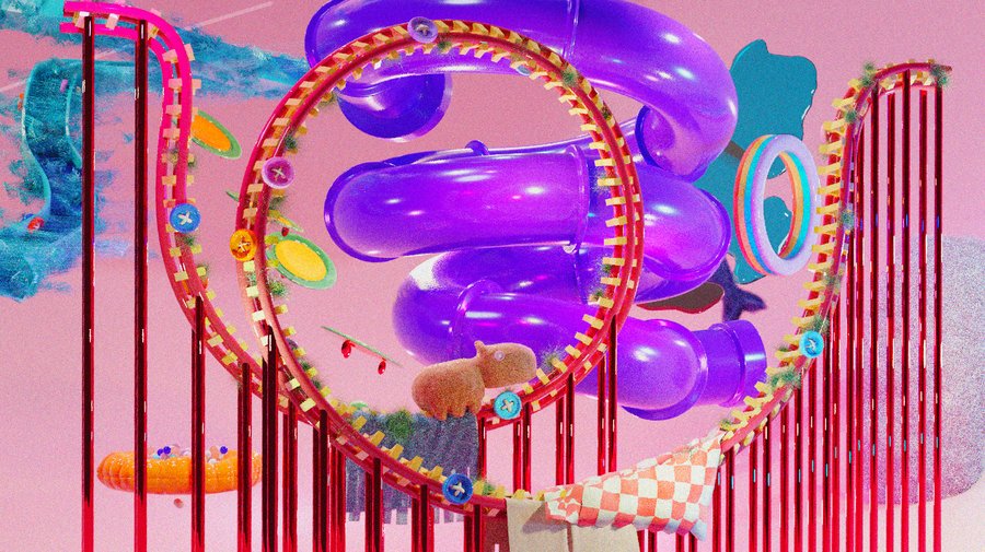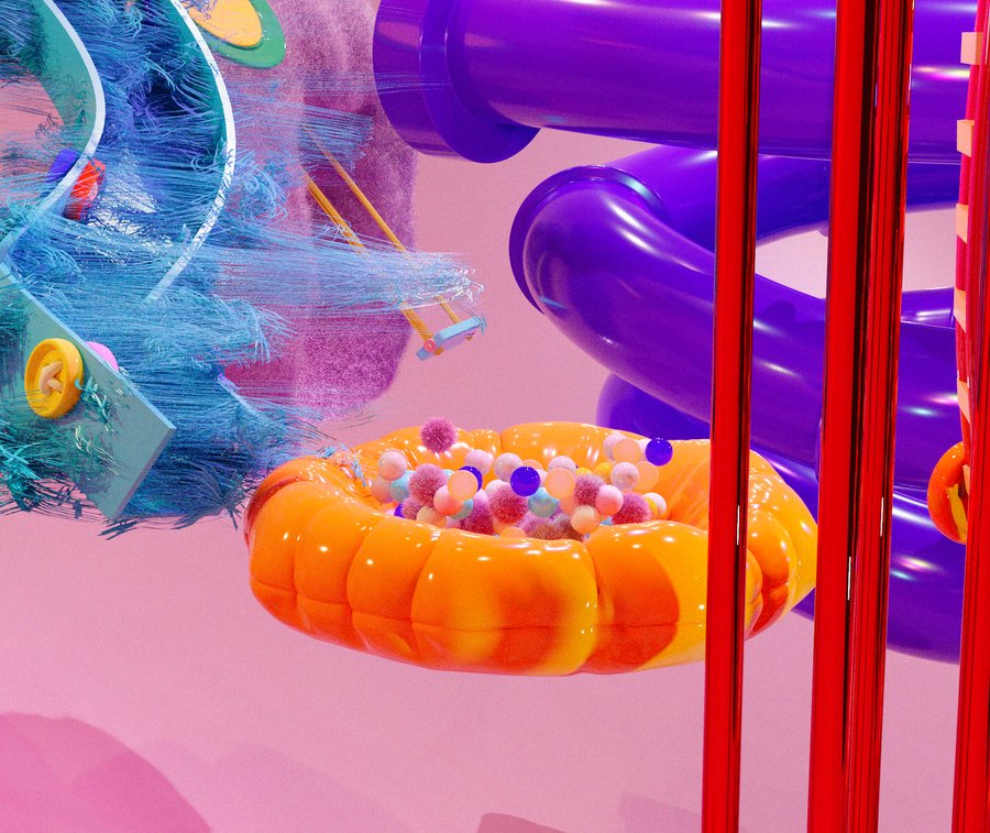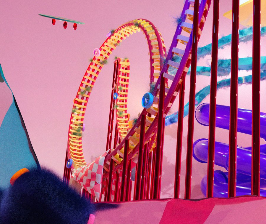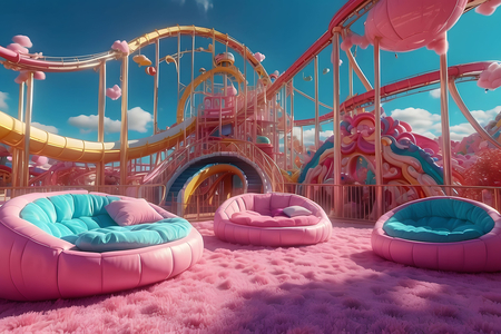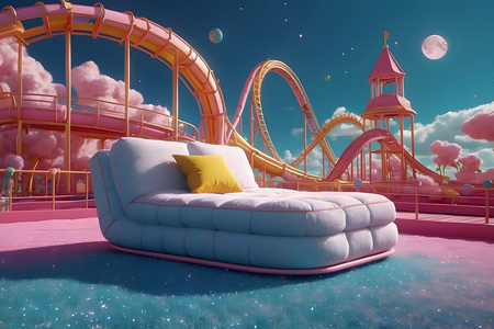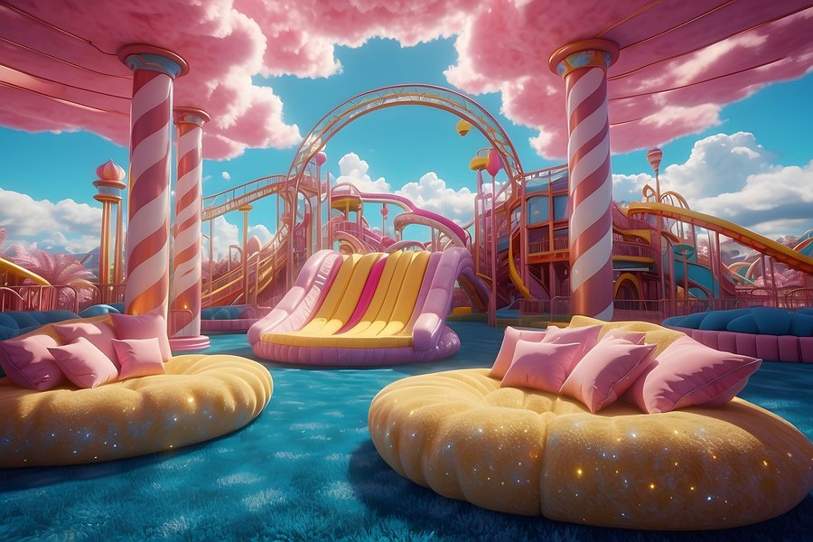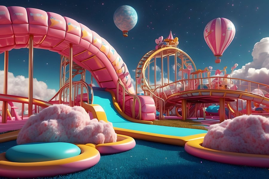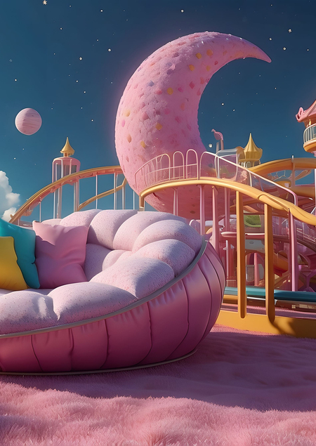 /imagine prompt: A 3D sleep space with rides, roller coasters and trampolines for pillow pack company that will be shiny, soft and fluffy. Use pink, yellow and blue colors