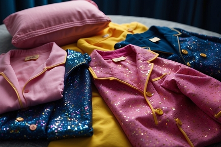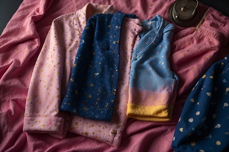 /imagine prompt: generate a photo of pajamas with honeymoon for children using pink, yellow and dark blue colors