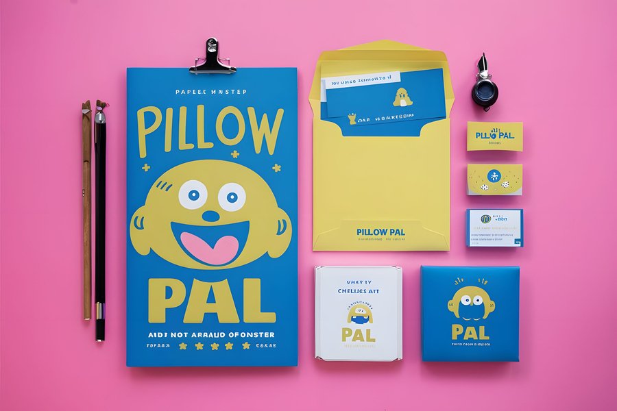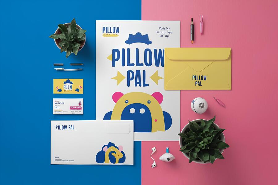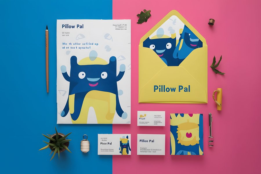 /imagine prompt: a mockup of printed materials (paper, envelope, business cards) on a white background for the «pillow pal» company which help children to fall asleep