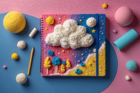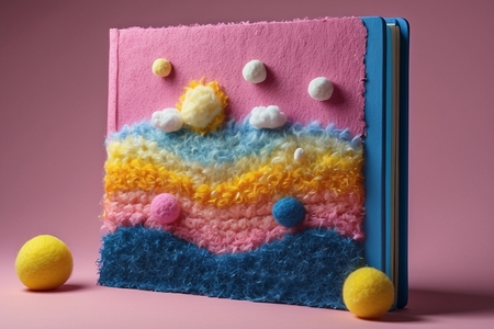 /imagine prompt: generate a fluffy and woolly surface 3d sketchbook with honeymoon object for a child using pink, yellow and dark blue colors