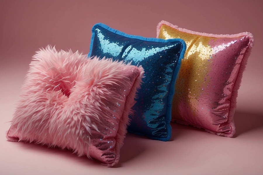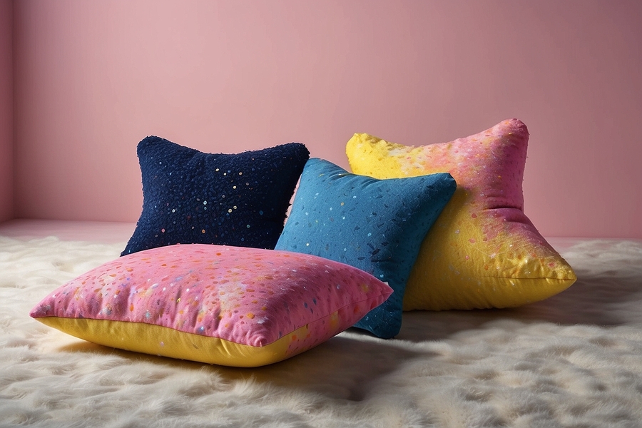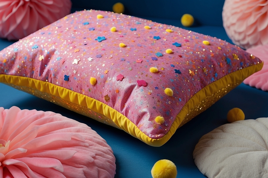 /imagine prompt: generate a fluffy surface of 3d pillows with honeymoon object for a child using pink, yellow and dark blue colors