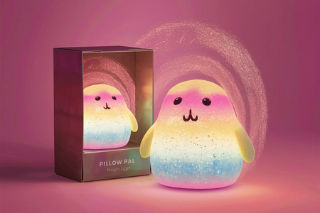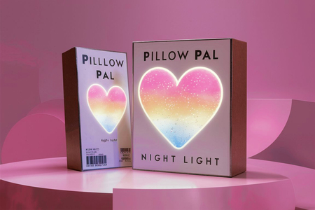 Для создания упаковки продукта применялся инструмент ideogram. Полные промпты для упаковки: 1 /imagine prompt: A minimalistic cardboard package mockup for a night light product called «Pillow Pal.» The night light features a soft, glowing heart design in pink, yellow, and blue colors, with glitter to create an enchanting ambiance. The cardboard packaging is designed with a shiny finish and a barcode on a white background. This product is perfect for malls, helping children feel secure and fall asleep with the comforting glow of the Pillow Pal night light. 2 A mockup of a minimalistic cardboard package for the «Pillow Pal» night light product. The box features a soft, glowing design in pink, yellow, and blue colors, with glitter to create an enchanting ambiance. The cardboard packaging has shiny finish. The background of the image is a warm pink color.