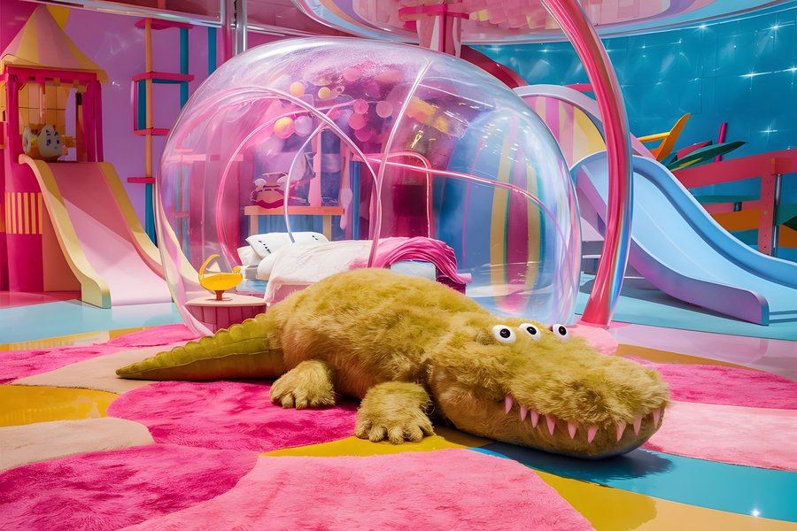 Полные промпты: 1 /imagine prompt: A vibrant 3D render of a transparent sleeping space, designed like a mini amusement park. The room has a fluffy, colorful floor with slides in the background and pink, yellow and blue hues dominate the scene. A huge fluffy and woolly crocodile toy with three button eyes and big tail lies in the room. 2 /imagine prompt: The vibrant environment features a blend of pink, yellow, and blue colors, creating a lively and energetic atmosphere. Fluffy clouds float in the sky, and the trampolines are adorned with plush pillows for added comfort. The roller coasters and rides are sleek, shiny, and covered in soft, fluffy materials. 3 A 3D render of a sleeping space, filled with pink, yellow and blue elements. The floor is fluffy and slides of an amusement park winding around the transparent room. The gates should look like candies with cotton candy.