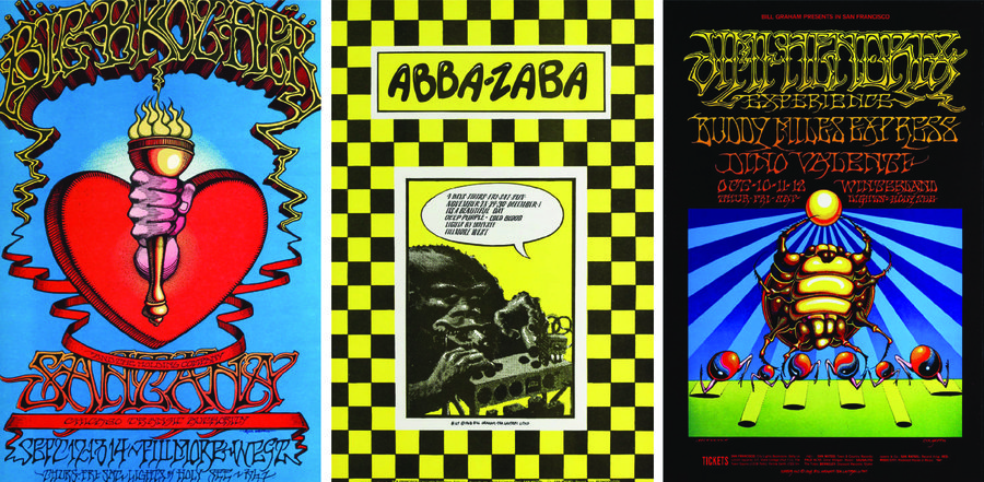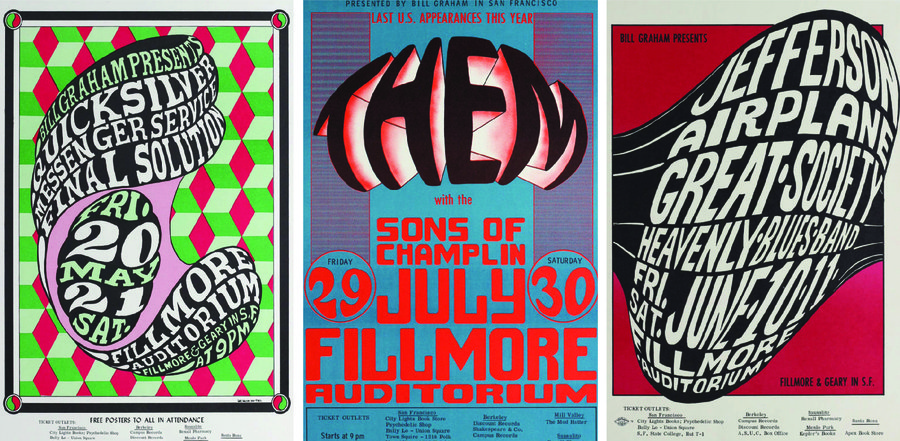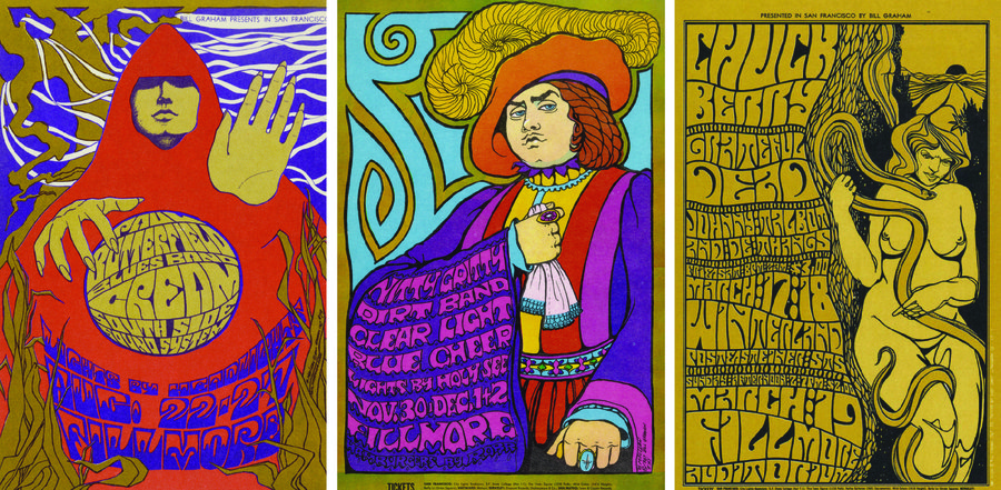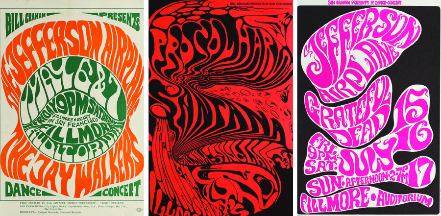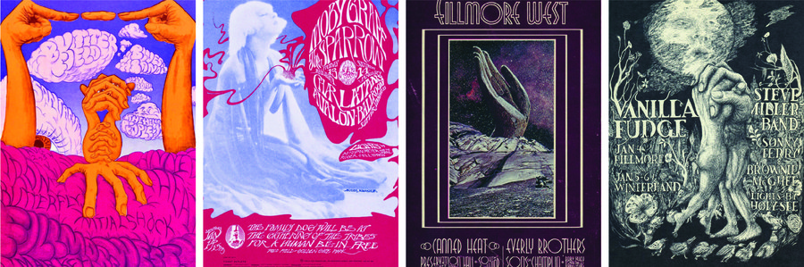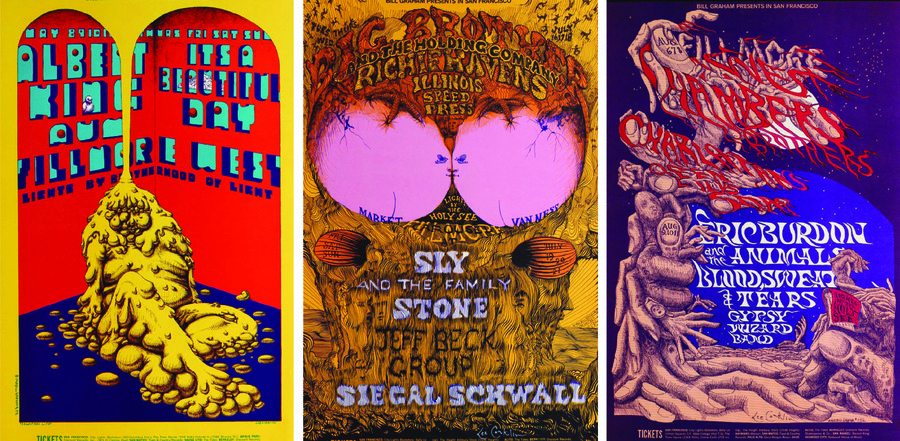 (1-3) Уэс Вилсон — постеры для Chambers Brothers и Jefferson Airplane, 1966-67 / (2) Виктор Москосо — постер для The Miller Blues Band, 1967