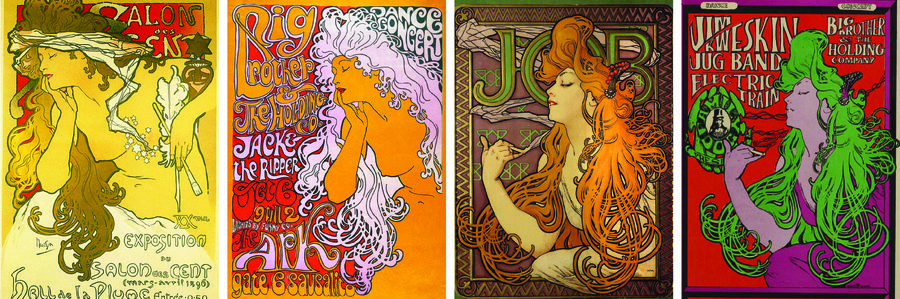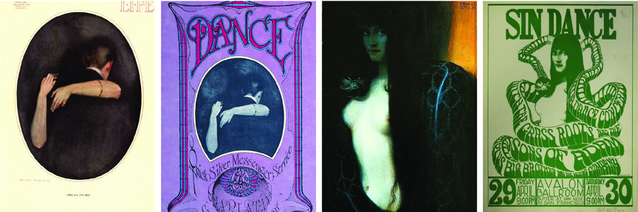 (1,3) Работы Альфонса Мухи, 1896 /(5) Обложка журнала «Life», 1909 / (7) «Грех» Франц Штук, 1893 / (2,4,6,8) Постеры 60х для концертов в Avalon Ballroom, 1966