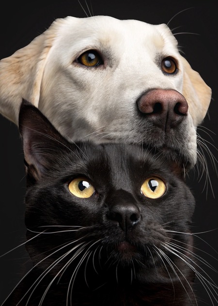 Изображение сгенерировано в нейросети Recraft. Промпт: Make a very close up of the black dog and white cat’s face on a black background