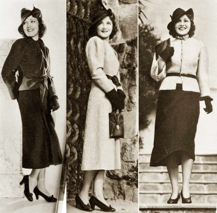 Облегающие трикотажные пуловеры с юбками длиной по середину голени, пышные вечерние платья, скорее напоминающие моду «прекрасной эпохи» 1890-х (что было достаточно распространенным трендом в дизайне вечерней одежды в 1930-е годы), минималистичные шляпки-клош, и даже брючный костюм для верховой езды — все эти образы идут вразрез с представлениями о моде военного десятилетия.