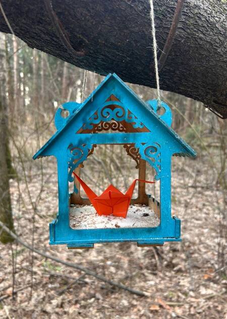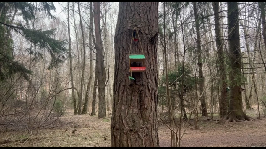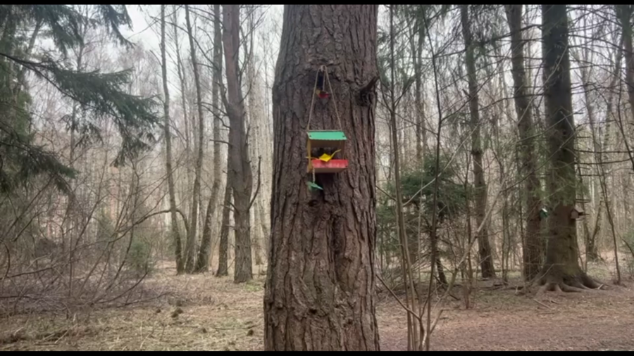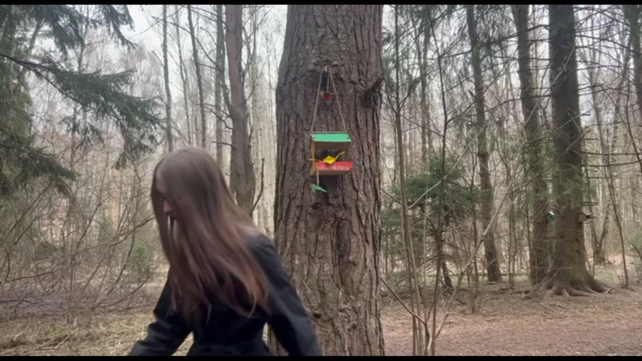 Действие моей работы происходит в лесу, в котором я обычно гуляю. Я часто останавливаю свой взгляд на местных скворечниках: они все разных цветов и форм, переполнены кормом и кусочками хлеба, а еще их очень много. Любопытно, что я ни разу так и не увидела в них птиц.