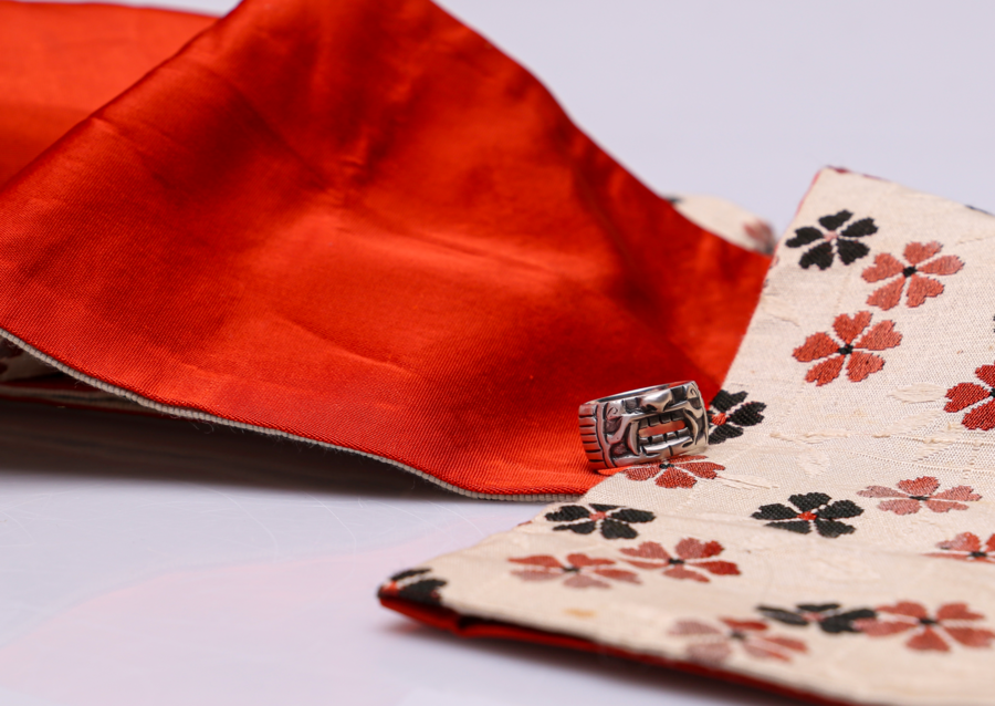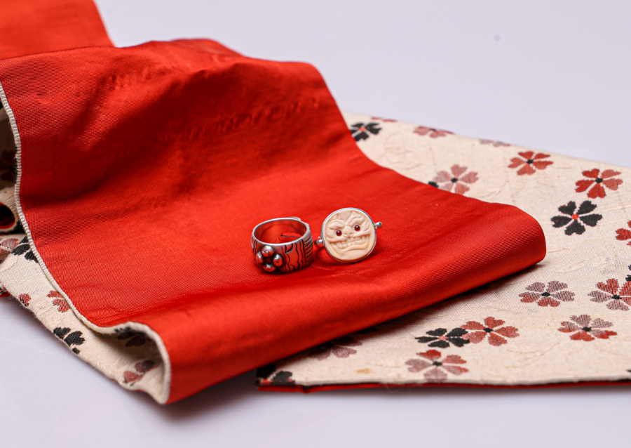 «Дольда» — широкое кольцо, вдохновлённое балками чадарамок (крыша, напоминающая раскрытую корзину в храмах). В архитектуре храма нет лишних деталей, все являются опорными точками для баланса. Мне понравилась дуальность красоты запечатленной природы: пион, символ процветания и неказистого духа.