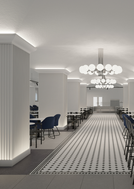 Помещение столовой в здании НИУ ВШЭ на Мясницкой, 20 представляет собой комплексную структуру с колоннами и сводчатыми потолками, позволяющую создавать различные варианты моделей освещения как с подвесных источников света, так и с источников, расположенных на колоннах и в нишах вдоль стен. При работе с проектом в реальном времени за основу проекта освещения была взята модель распределения света, схожая со станциями метрополитена, на которых свет также отражается от сводов и распространяется между колонн. Особенностью данного пространства является практически полное отсутствие естественного освещения, единственными источниками дневного света являются небольшие окна-колодцы.