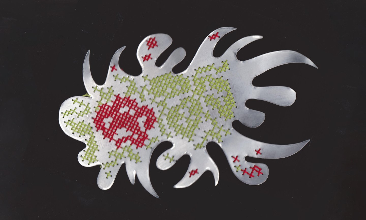 Главной техникой была выбрана вышивка по металлу: она отражает нежную русскую душу (аккуратная вышивка крестиком) в крепком и сильном русском теле (металлическая основа).