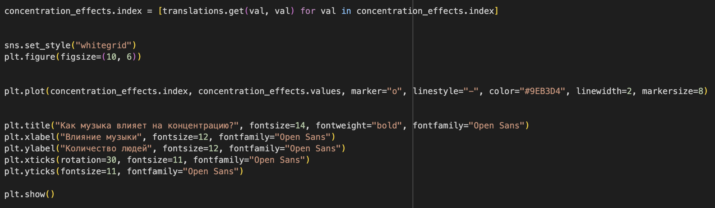 4. График функций показал, что восприятие влияния музыки на концентрацию сильно варьируется. Большая часть людей отмечает положительное влияние, но есть и те, для кого музыка мешает сосредоточиться.