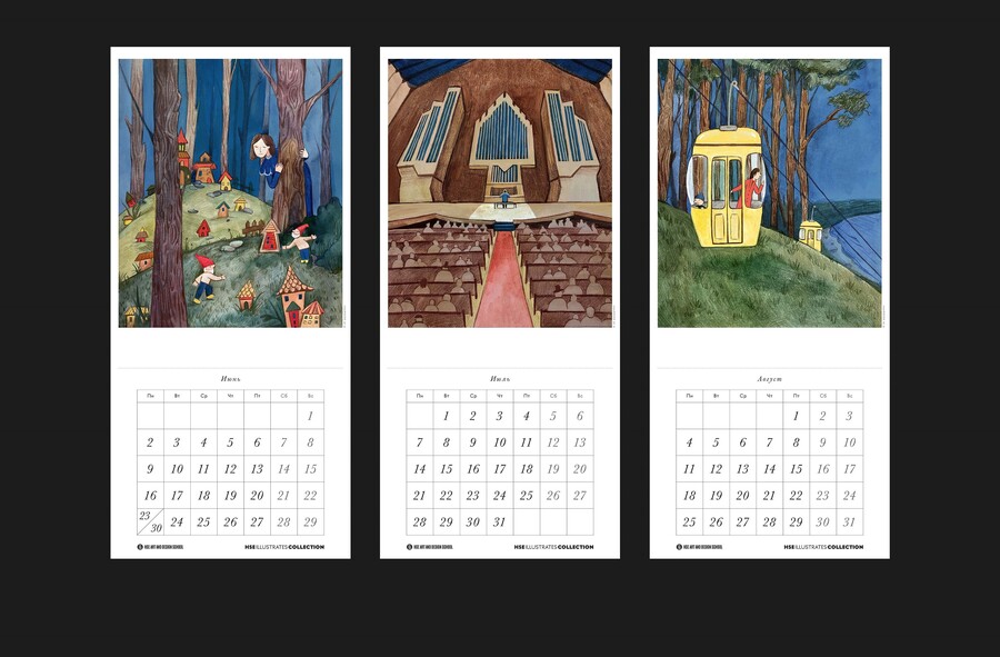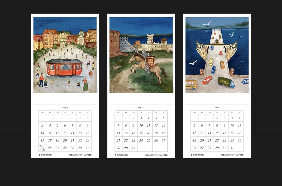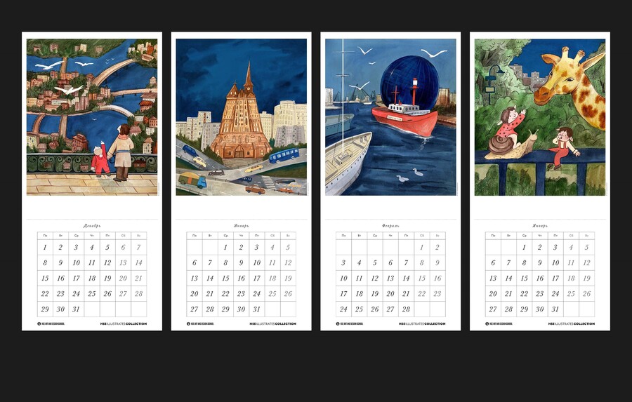 Kaliningrad is a small but very interesting area of Russia with a rich history and an unusual atmosphere. My illustrated calendar focuses on four cities in the Kaliningrad region: Svetlogorsk, Zelengradsk, Sulska, and Kaliningrad. A slightly naive style of performance was designed to convey a special comfort to this corner of Russia. Each season is dedicated to significant places, vivid images, and legends associated with these four cities.