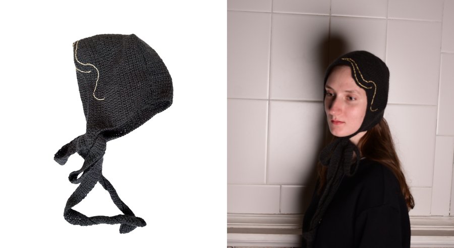 Сюрреалистический головной убор. Связанный мной в качестве мерча чепец. Он выполнен в виде причёски-холодной волны, которая не испортится в любую погоду.