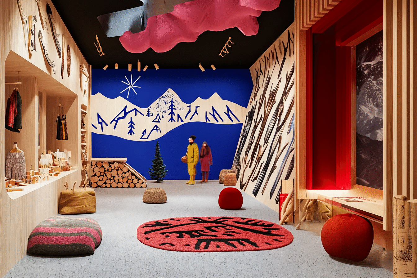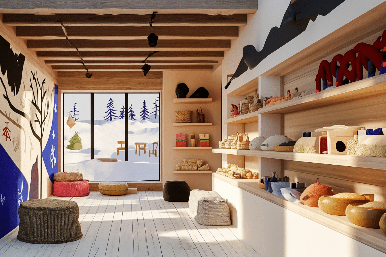 Design the interior of a unique souvenir shop called 'Heart of the North', inspired by the breathtaking landscapes and rich culture of the Yamal Peninsula. The shop should reflect the spirit of the Arctic and its traditions, showcasing handmade crafts and items that celebrate the region’s heritage. cosy, minimalistic