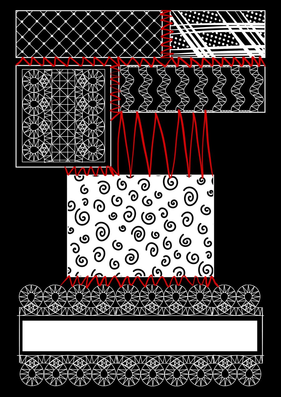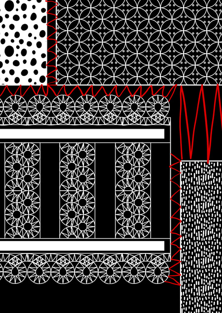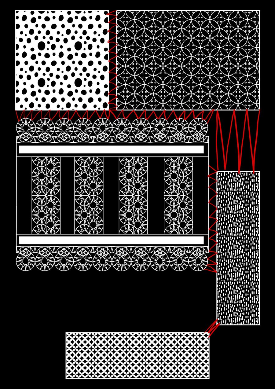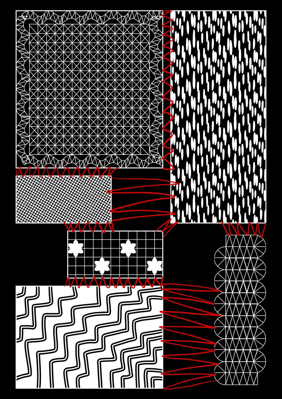 Для плетения елецкого кружева мастерицы используют сколки. Сколок — это рисунок узора будущего кружева. Из-за особенностей плетения с течением времени рисунок мог прийти в негодность и в буквальном смысле расколоться. Моей целью было соединить в проекте «осколки» традиционных сколков и «сшить» их с современными паттернами. Для гармоничного размещения применила модульную сетку.