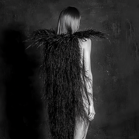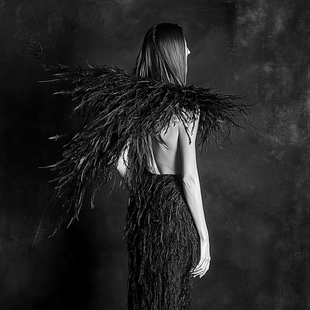 - A striking monochrome lookbook photograph featuring a slim long hair girl dressed in an avant-garde ensemble in Ann Demeulemeester campaigns style. She is wearing an long oversized long sleeve garment made entirely of black feathers. The overall effect is both bold and elegant, with a touch of surrealism and artistry., photo