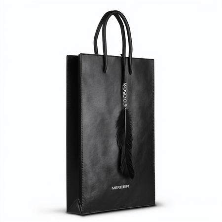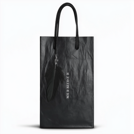 - A striking and unique front photo of rectangular shopping bag, which is made of black paper. The bag have a mininalistic chain on the handles with the black feather in the end of it. The bag feature a white minimalistic inscription that reads 'merger' on the front side. The background is plain white. This captivating image combines fashion, art, and a touch of the surreal., photo - A striking and unique front photo of a package, which is made of black glossy paper in style of filippo sorcinelli ne il giorno ne l’ora. The package is wrapped around by thin black ropes and have a minimalistic chain with the black feather in the end of it. The background is plain white. This captivating image combines fashion, art, and a touch of the surreal., photo