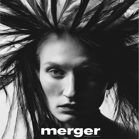 - monochrome poster with a realistic close up fashion photo of a female androgynous model with the text «merger» below it, written in white, she has very white skin, wet styling on her hair, black feathers wrapped around her hair, in style of self portrait and 032c