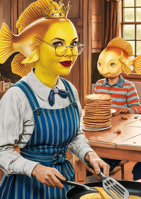 Промпт: a crayon illustration captures the extraordinary woman with a yellow face and a goldfish head, with a golden crown, red lipstick, and glasses. in a cozy kitchen, she holds a spatula and uses it to flip thin flapjacks in a frying pan. behind her, a large table is occupied by two casual-dressed children, each with goldfish heads, they’re eating their meal. in the center of the table there’s a towering stack of flapjacks.
