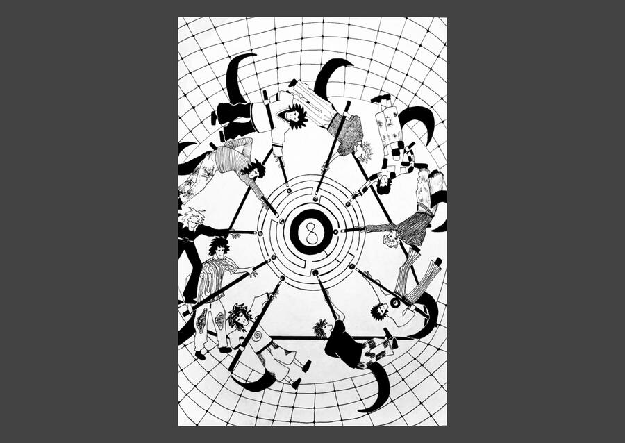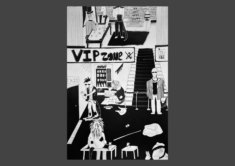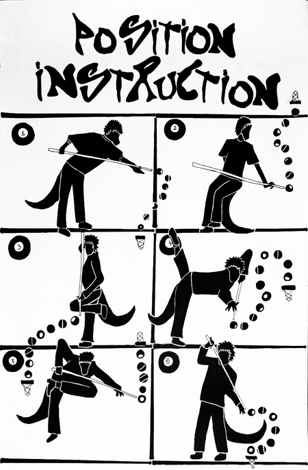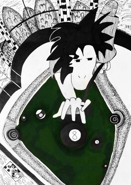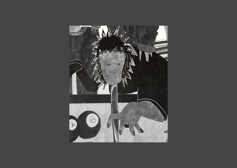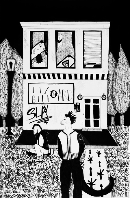 В ходе просмотра иллюстраций ничем не примечательный клуб становится уже целым хаотичным миром бильярда и ящериц, так мастерски играющих в него