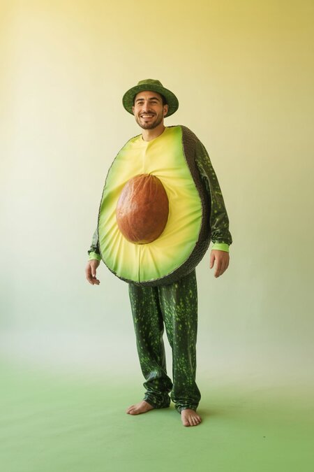 сгенерируй фото, где человек (мужчина) примерно 27 лет одет в костюм авокадо. фото в полный рост. мужчина улыбается. стиль реализм. соотношение 3:2