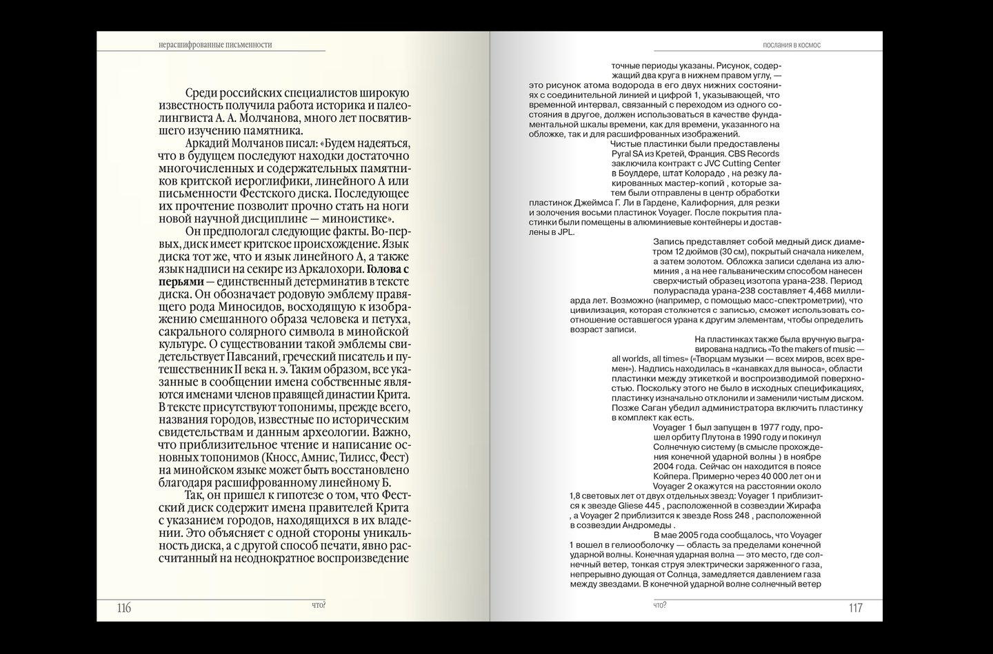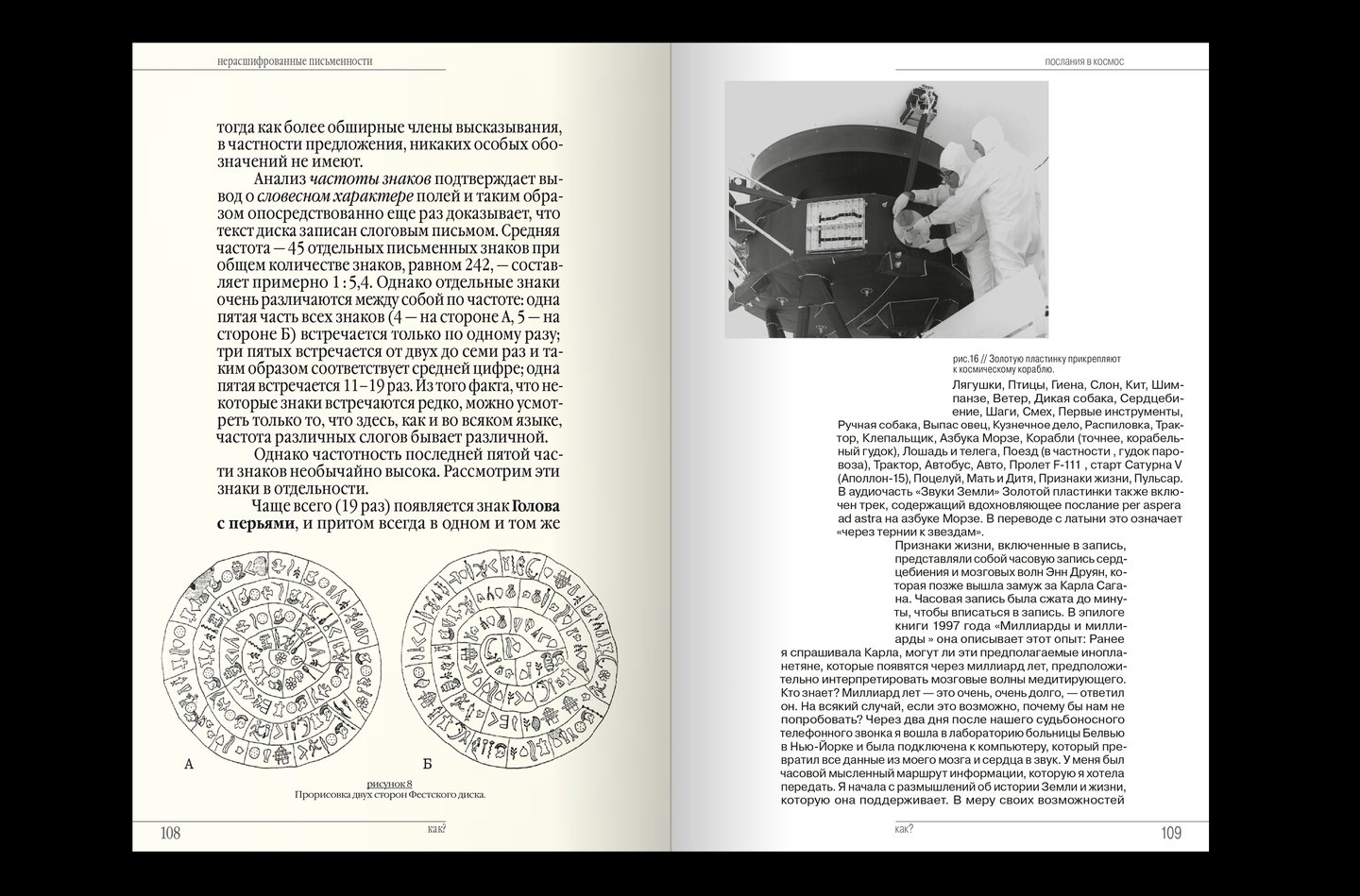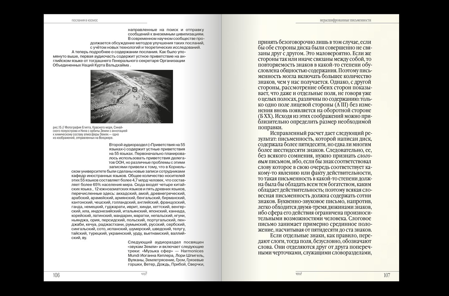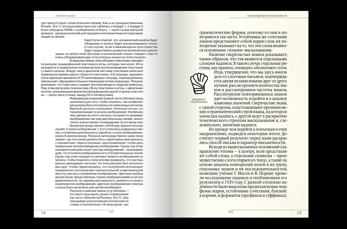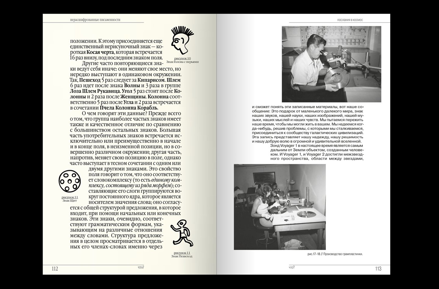 The design of the book gives the structure of the narrative. The book is printed on the  squealing sheets of two colors: yellowish and  white. The color of the leaf in test asks  what information will be on  it will be: yellowish & a; (a) — narrative about  uncoded scripts, white & y; (b) & y; — about  messages in kosmos. On  single-colored turns in  the mid-points of the notebooks (‌c) are discussed in detail for specific examples of scripts or messages.