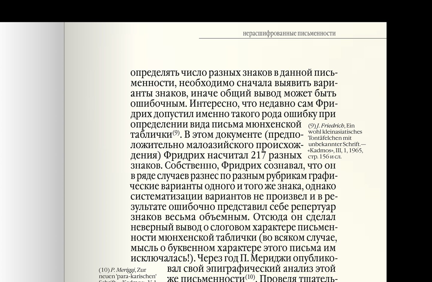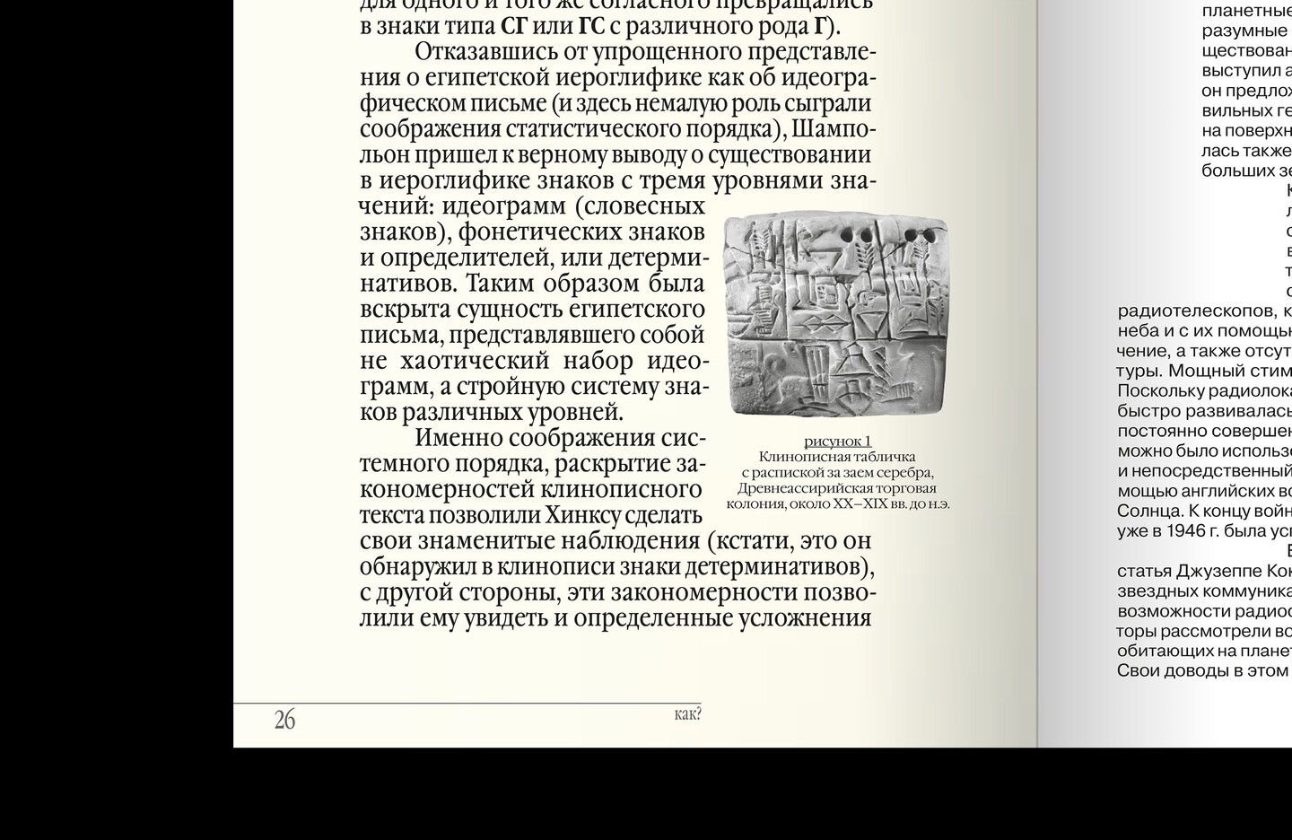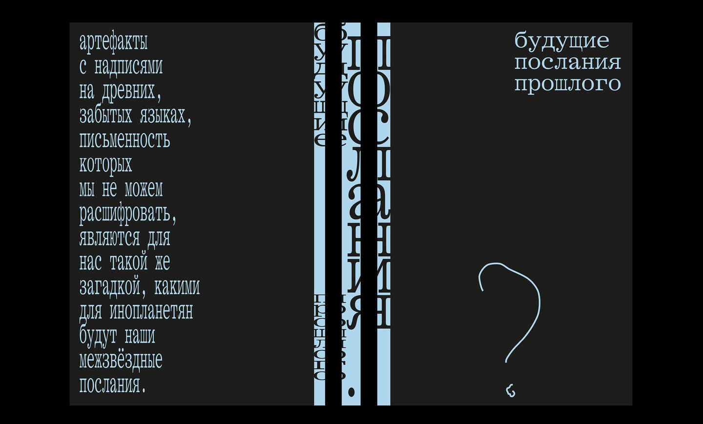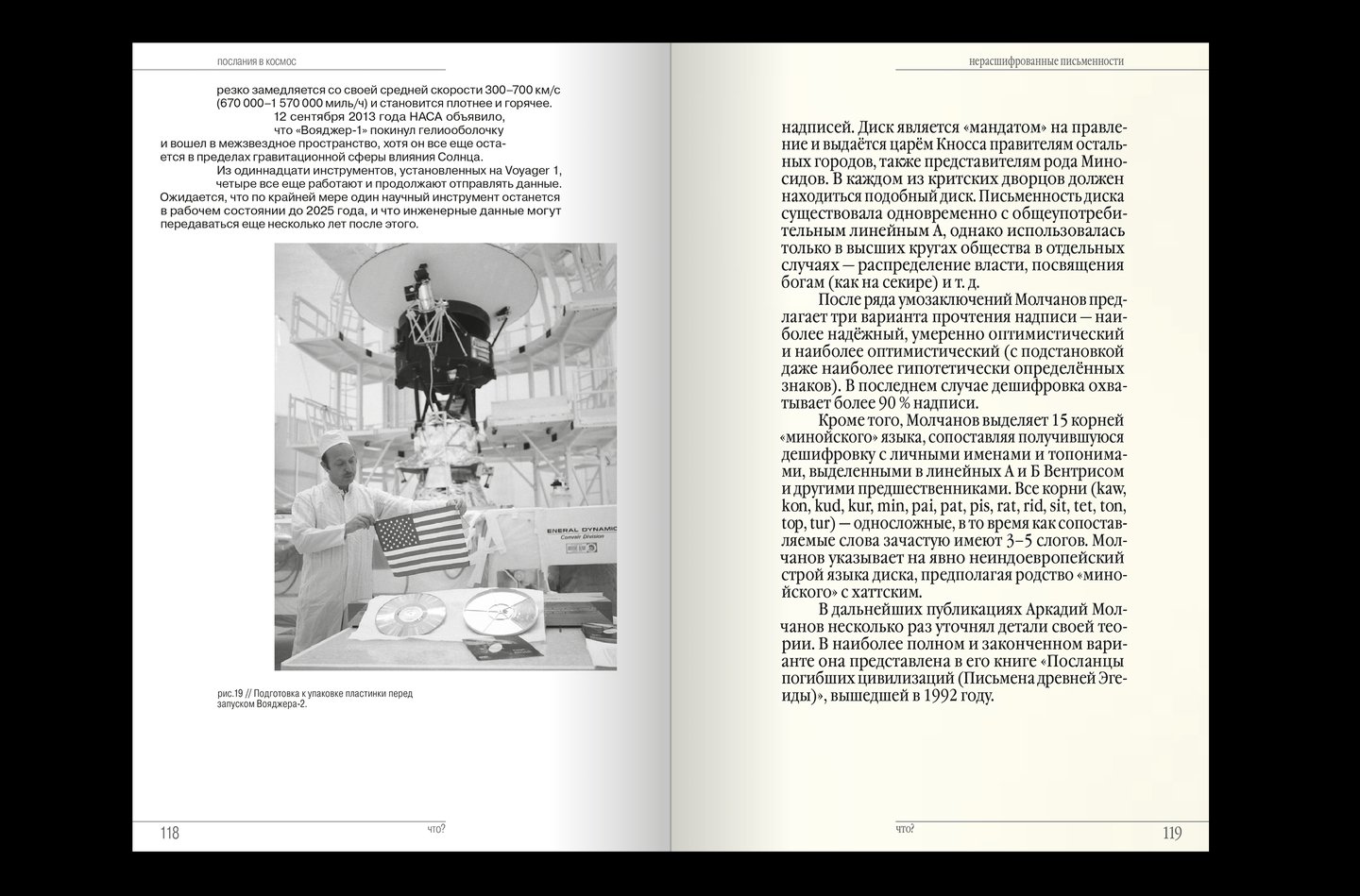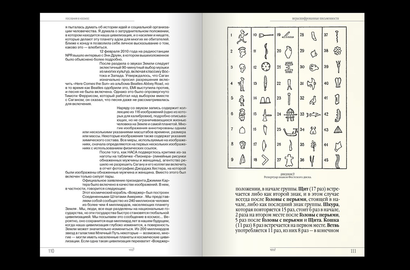 The design of the book gives the structure of the narrative. The book is printed on the  squealing sheets of two colors: yellowish and  white. The color of the leaf in test asks  what information will be on  it will be: yellowish & a; (a) — narrative about  uncoded scripts, white & y; (b) & y; — about  messages in kosmos. On  single-colored turns in  the mid-points of the notebooks (‌c) are discussed in detail for specific examples of scripts or messages.