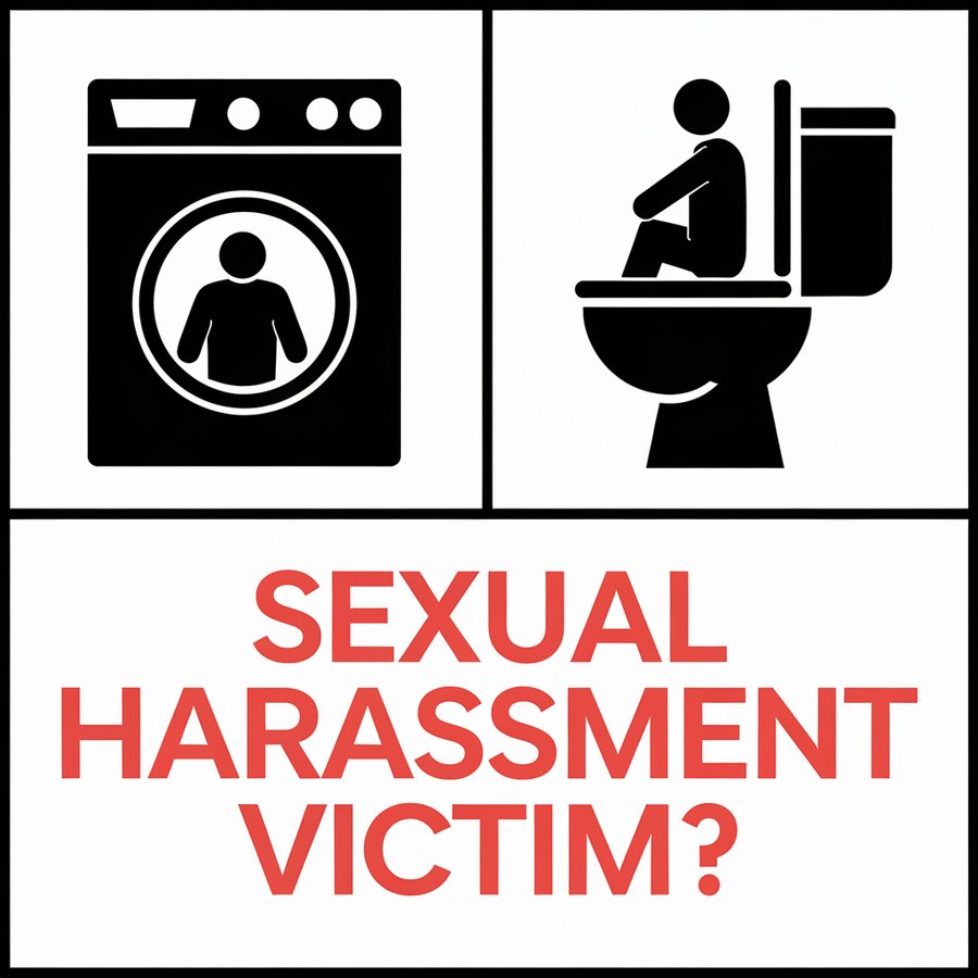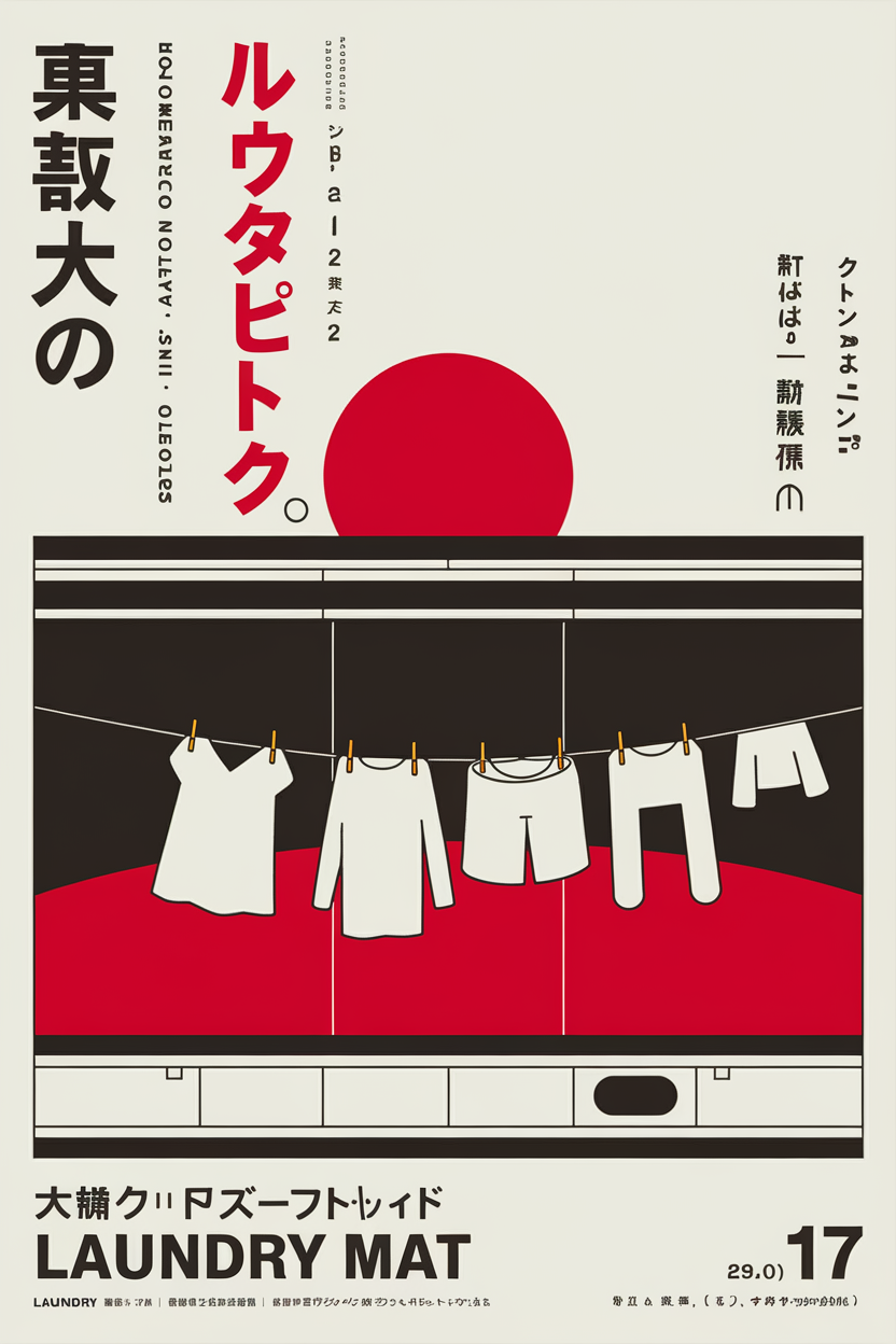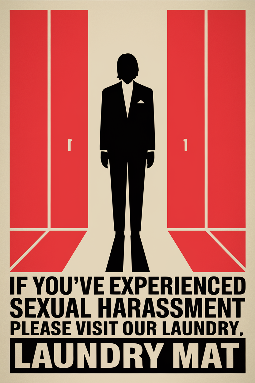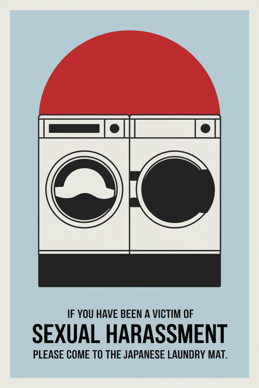 Prompt: A minimalistic style poster with the text «If you have been a victim of sexual harassment, please come to the Japanese laundry mat.» The poster is in red, white, and black colors. There is a laundry mat icon with a washing machine and a drying machine. The background is a light blue color.