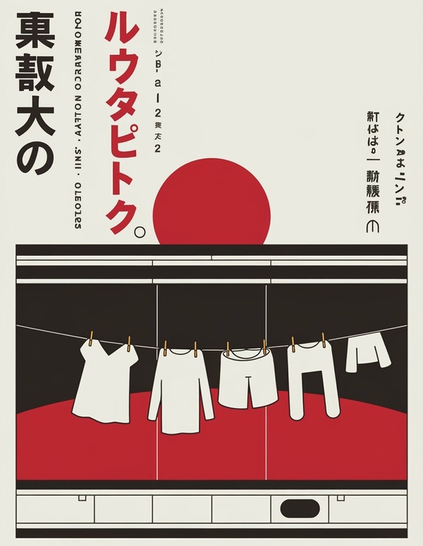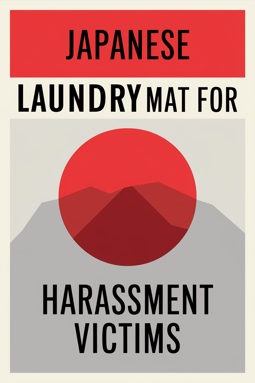 Prompt: Mini brief poster for a Japanese laundry mat for sexual harassment victims in red, white and black colors and minimalistic style.