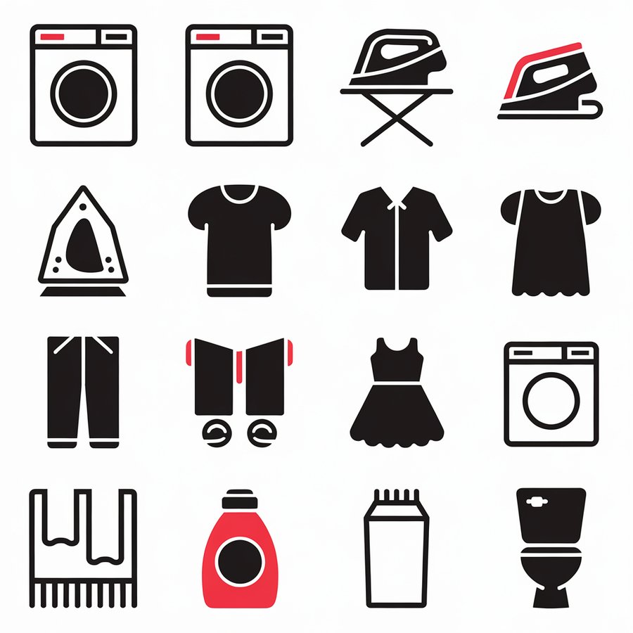 Prompt: A set of black, white, and red icons for a Japanese laundry mat. The icons include a washing machine, a dryer, an iron, a shirt, a pants, a dress, a towel, a detergent, and a toilet. The background is white.
