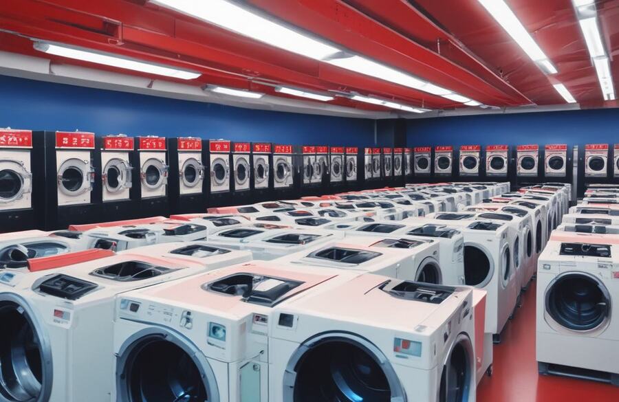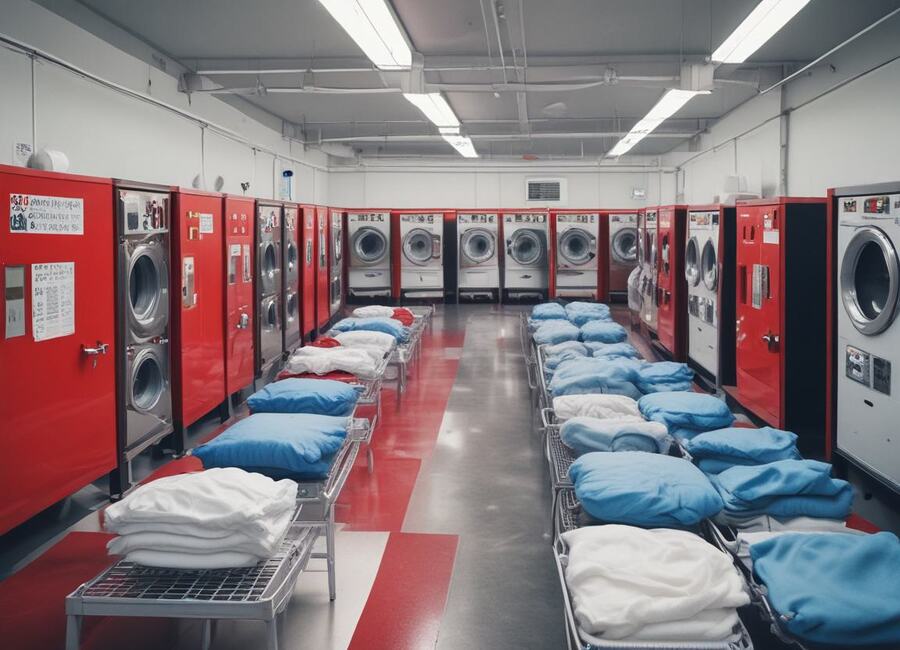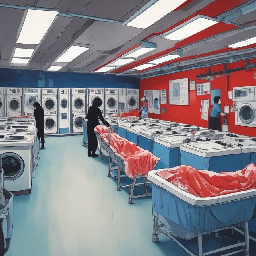 Prompt: Japanese laundry for victims of sexual assault. The palette of space is red, black, soft blue, white. Attributes — washing machines, high chairs, sofas, clothes, dryers, washing powders.