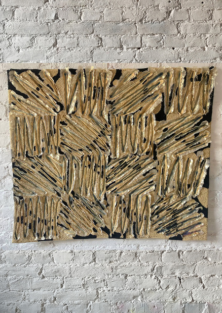 Идея заключалась в том, чтобы передать красоту полей с высоты птичьего полета. Золотистые поля, активная фактура земли — всё соединено многослойной технологией. Работа выполнена с применением нескольких текстильных техник. Цвет исходной ткани сначала вытравливался, потом прокрашивалось в технике батик. Потом настрачивание нескольких слоев, с последующим прорезанием. А затем выполнена техника ручной ковровой вышивки. Использованы ткани с золотым блеском, что добавляет работе объём и оптическое мерцание.