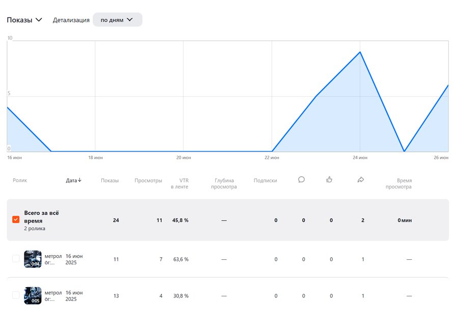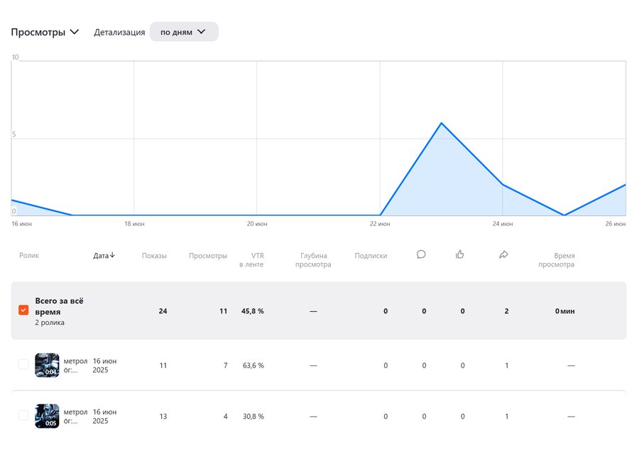 Дзен показывает низкие показатели показов, но высокую вовлечённость. Здесь публикация находит более заинтересованную и узкую аудиторию, что подтверждается лайками, подписками и репостами, несмотря на низкий общий охват.