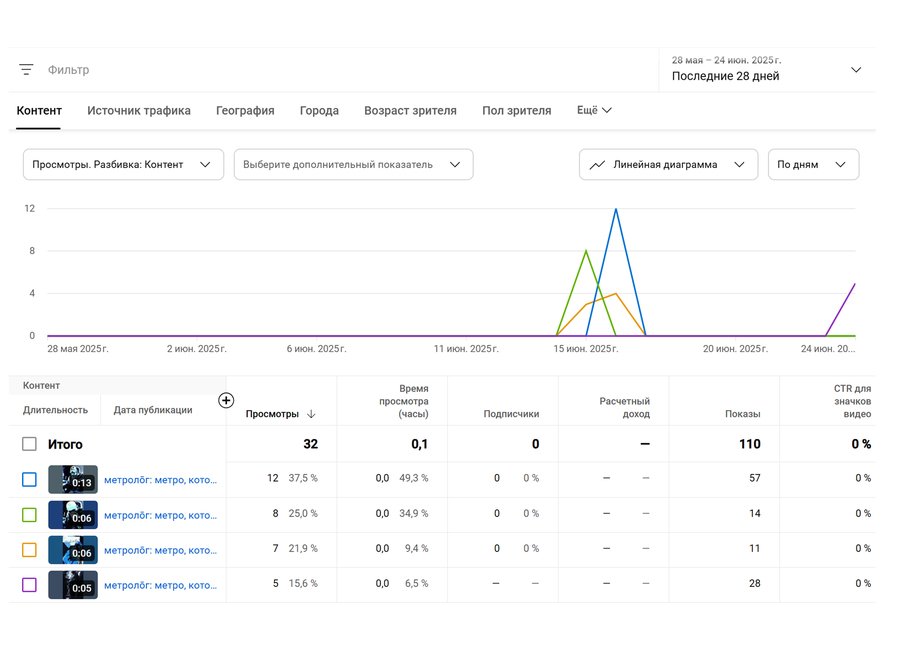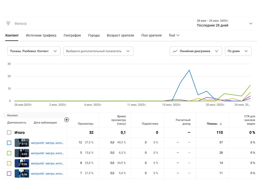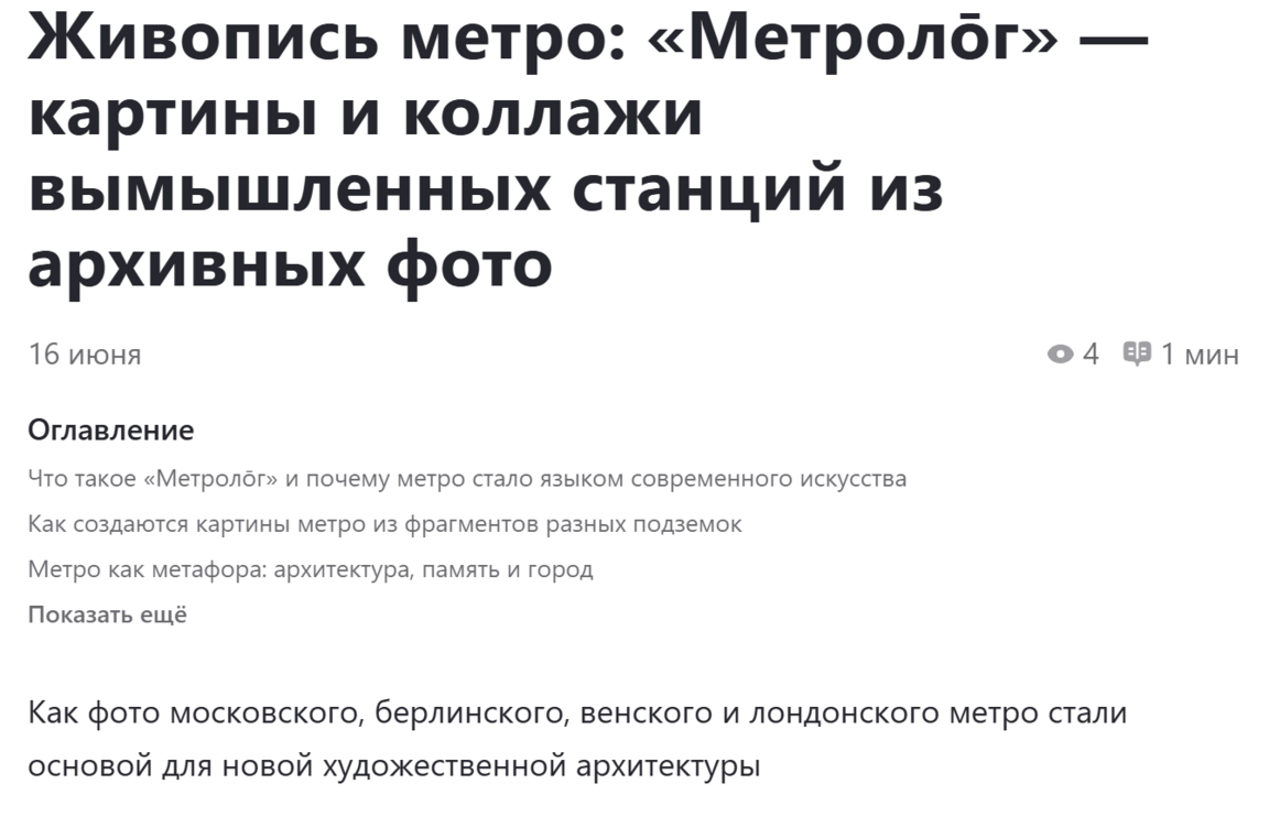 В рамках продвижения проекта «Метролōг» я опубликовала контент на нескольких платформах: статьи на Яндекс.Дзене и Пикабу, а также короткие вертикальные видео на YouTube и Дзене.
