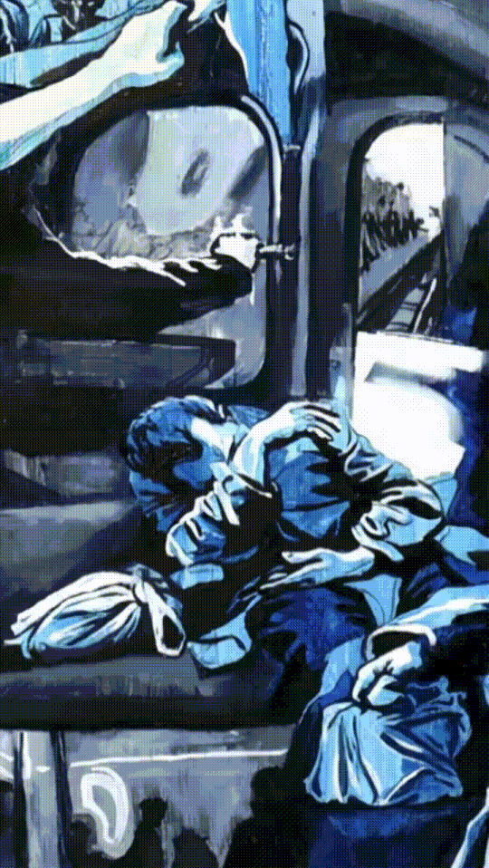 Для создания промптов был использован ChatGPT. Примеры промптов: 1. Create the effect of accelerated time: the lights of the tunnel flicker outside the window, the passengers around him appear and disappear, but the man continues to sleep in the same position. 2. Animate the man in the picture to take a sip from the can he is holding. Create a subtle sensation that he is sitting in a moving subway (e.g., slight swaying motion, ambient subway sounds). Do not add any new objects or elements to the scene — only animate the existing content.