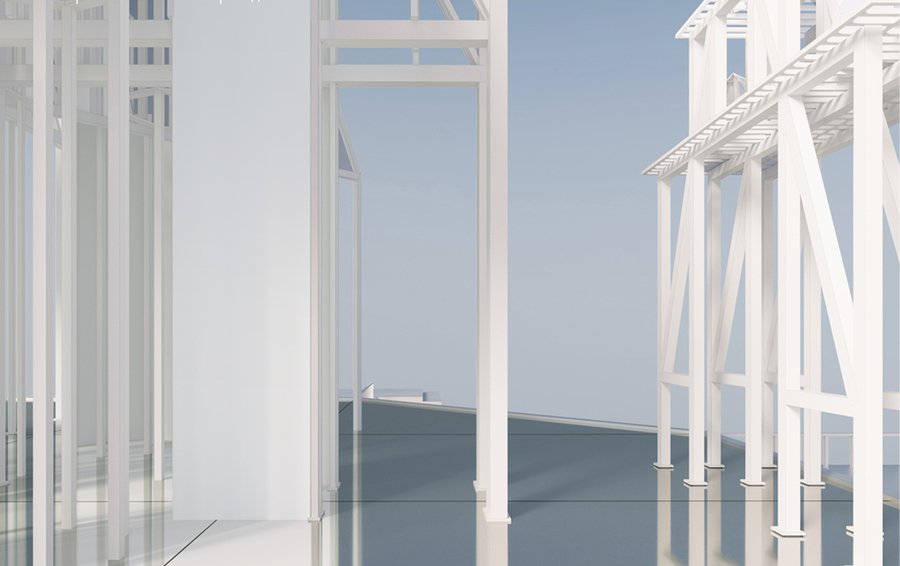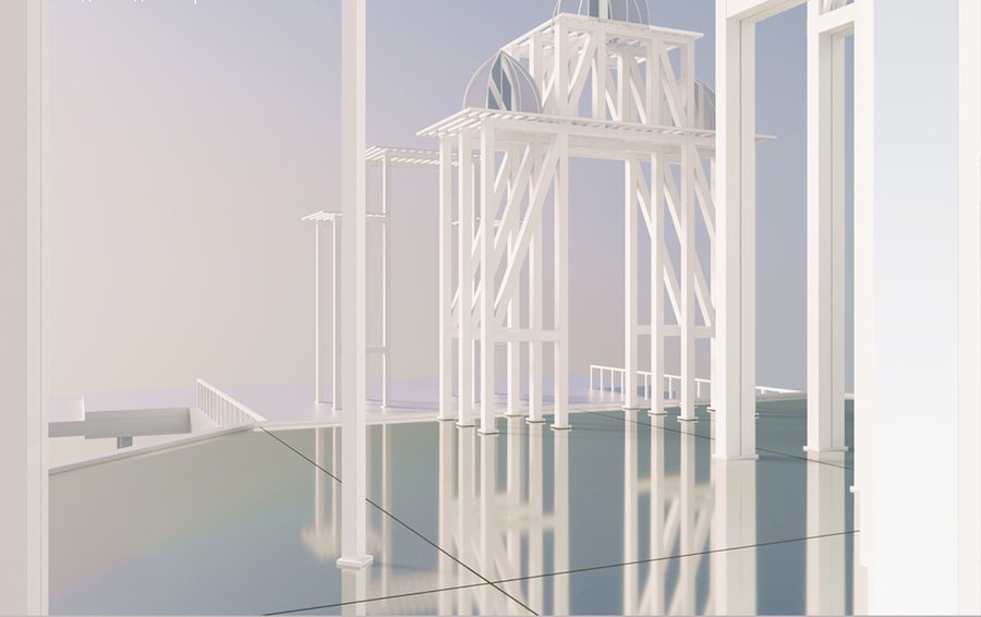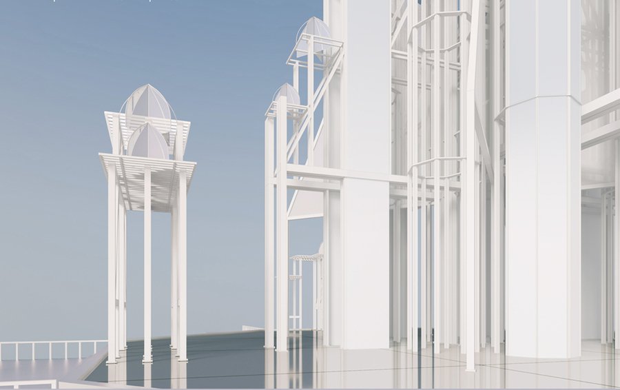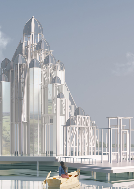 Павильон расположен на воде. В основаниинаходится платформа на металлических опорах. Платформа имеет выносы по четыремсторонам с причалами для лодок. По четырем сторонам также расположены входные ворота, по двое с каждой стороны. Они отделяют зоны причала для выставки людей, зонумостов ведущих к павильону, и площадку самого павильона. В плане вся конструкция имеет крестообразную форму, что характерно для храмов русского севера. Конструкция павильона состоит из отдельных модулей, которые в свою очередь собраны из металлических колон разной ширины. Снизу ширина пролетов позволяет пройти большому количеству людей. В верхней части конструкция приобретает многоуровневость, каждый уровень увенчивается куполом, собранным из металлических полуарок и зеркальных плоскостей. Чем ниже находятся купола, тем больший радиус они имеют. Такая иерархия прослеживается и в куполах храмов русского севера Центральный верхний купол имеет самый большой радиус.