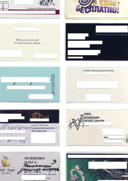 В семейном архиве мной было найдено около 500 визиток в стопках, хранящихся в ящиках комода. Каждая из них — отложенная мысль, желание, знакомство, возможность. Маленькая отложенная на бесконечное «потом» жизнь, так и оставшаяся невостребованной. Личность людей, стоявших за этими артефактами, так же стирается и исчезает, оставляя после себя только колоритные напдписи, использовавшиеся для привлечения внимания, и редкие личные ассоциации.