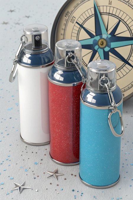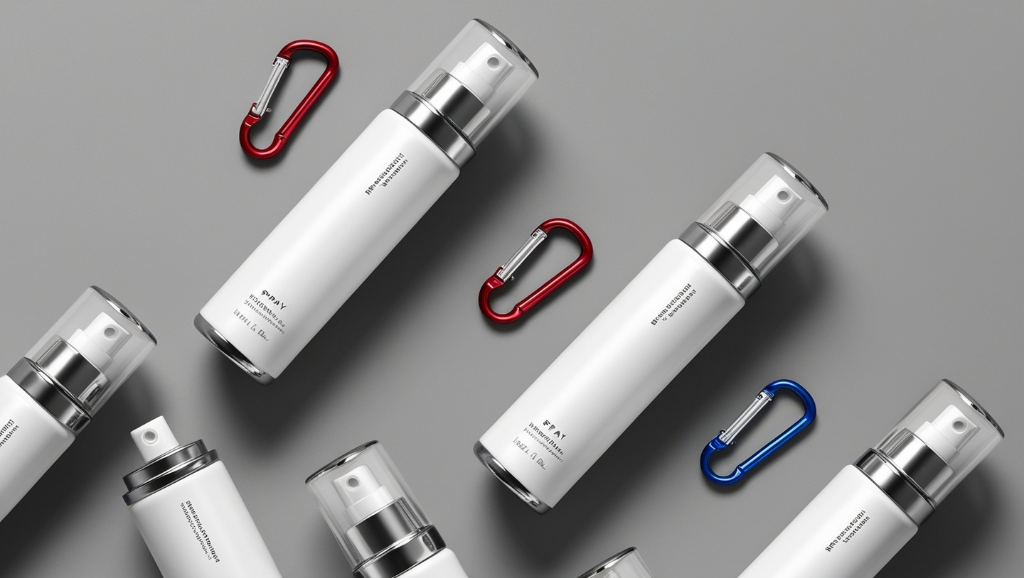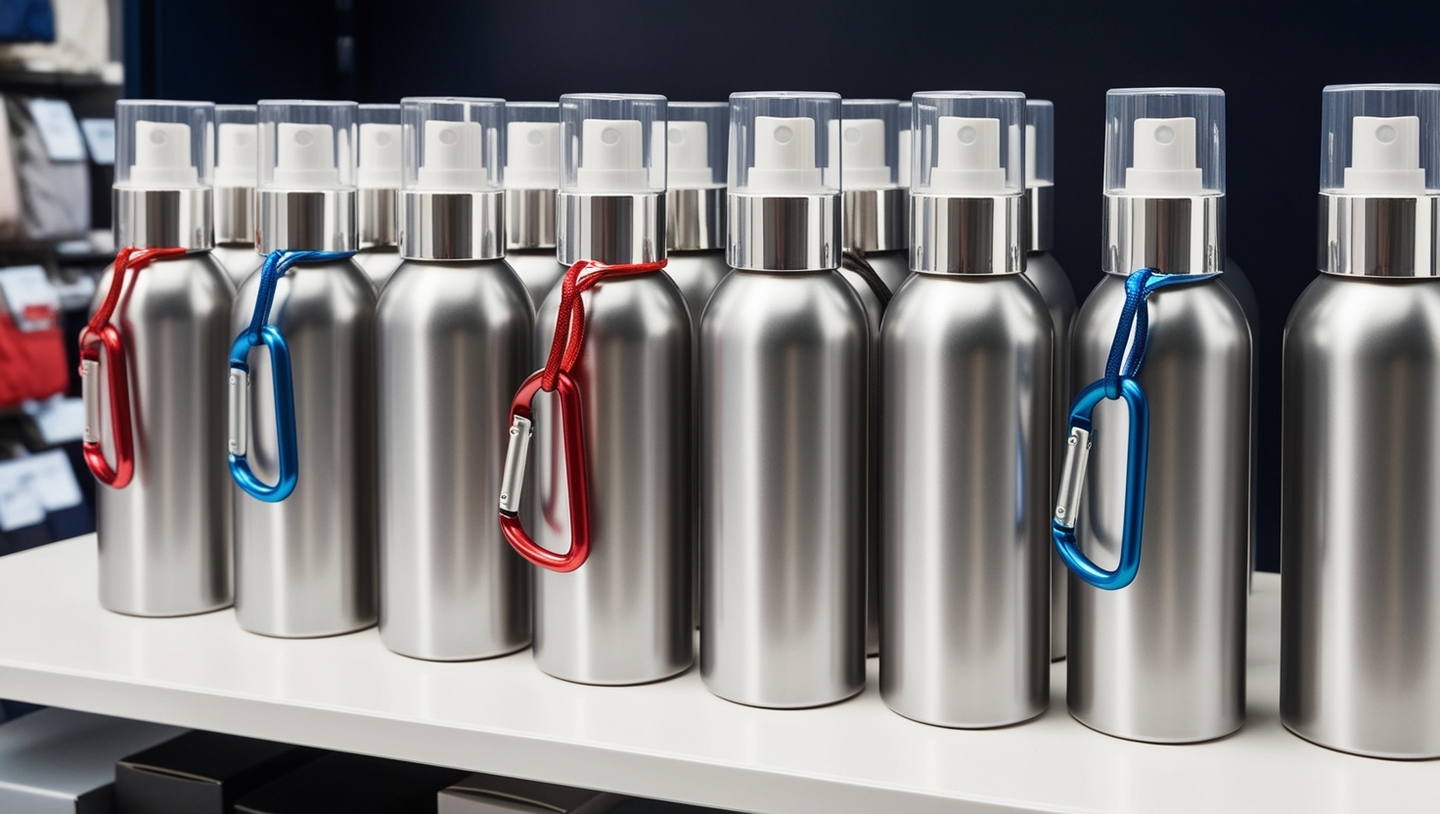 Promt: Modern and minimalistic water-repellent garment sprays in the form of sleek cylindrical bottles with silver metallic finish and transparent caps. A small red or blue carabiner clip is attached to the bottle, emphasizing portability. The layout includes several bottles arranged in an organized manner on a shelf in a travel goods store.