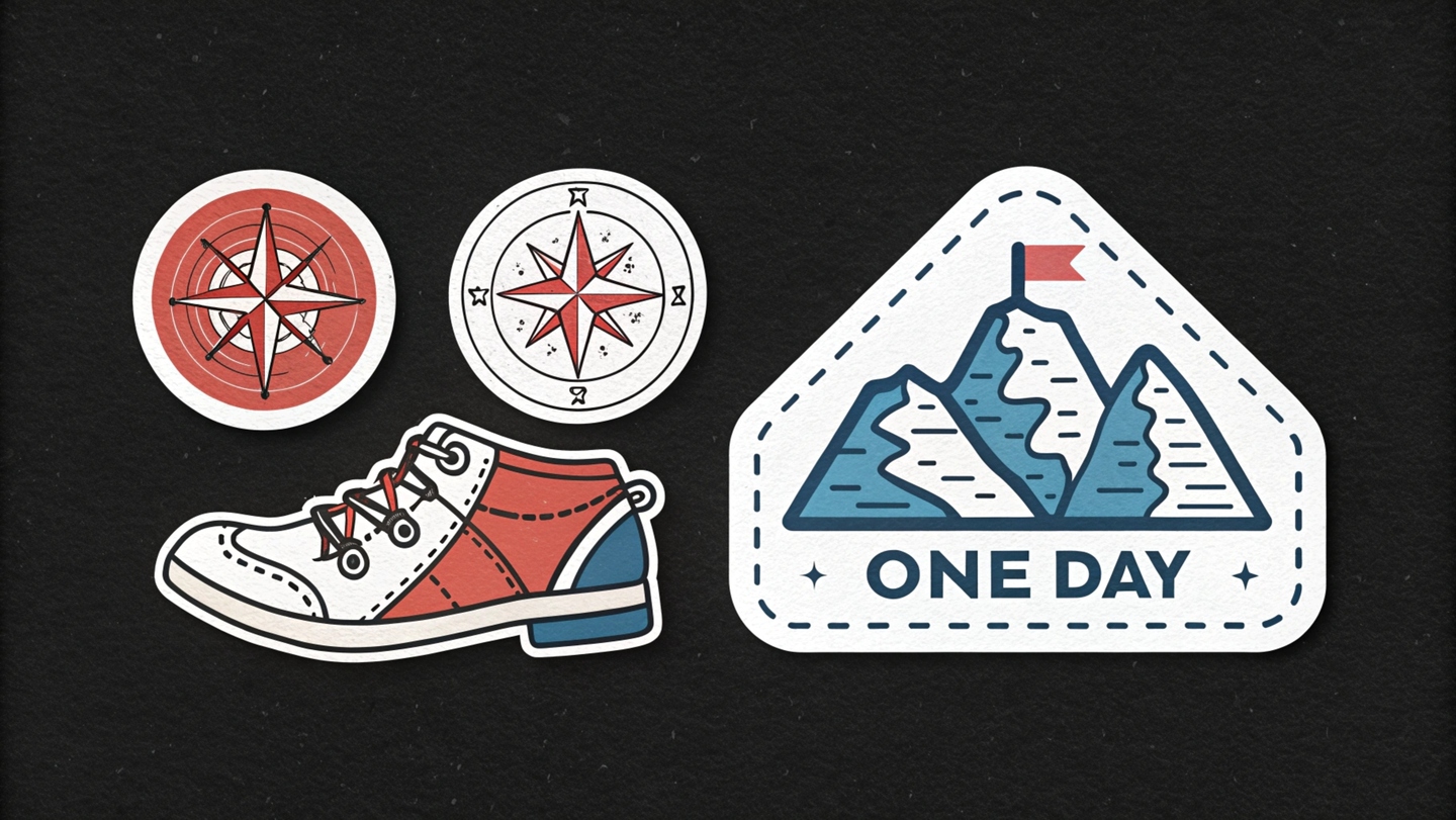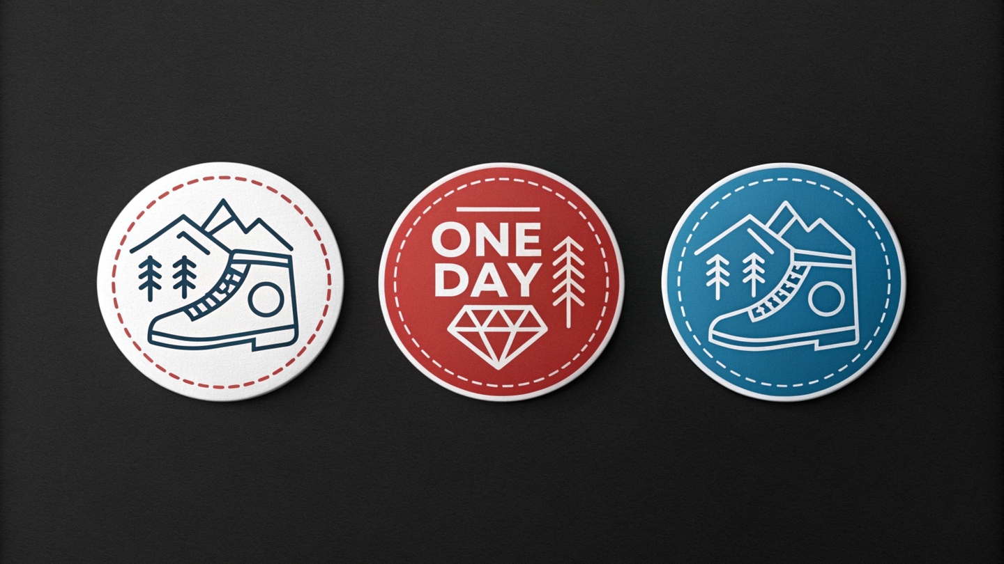 Prompt: Create a variety of minimalist stickers for clothing and footwear care products for hiking related brand ONE DAY using white, red and blue colors on a black background